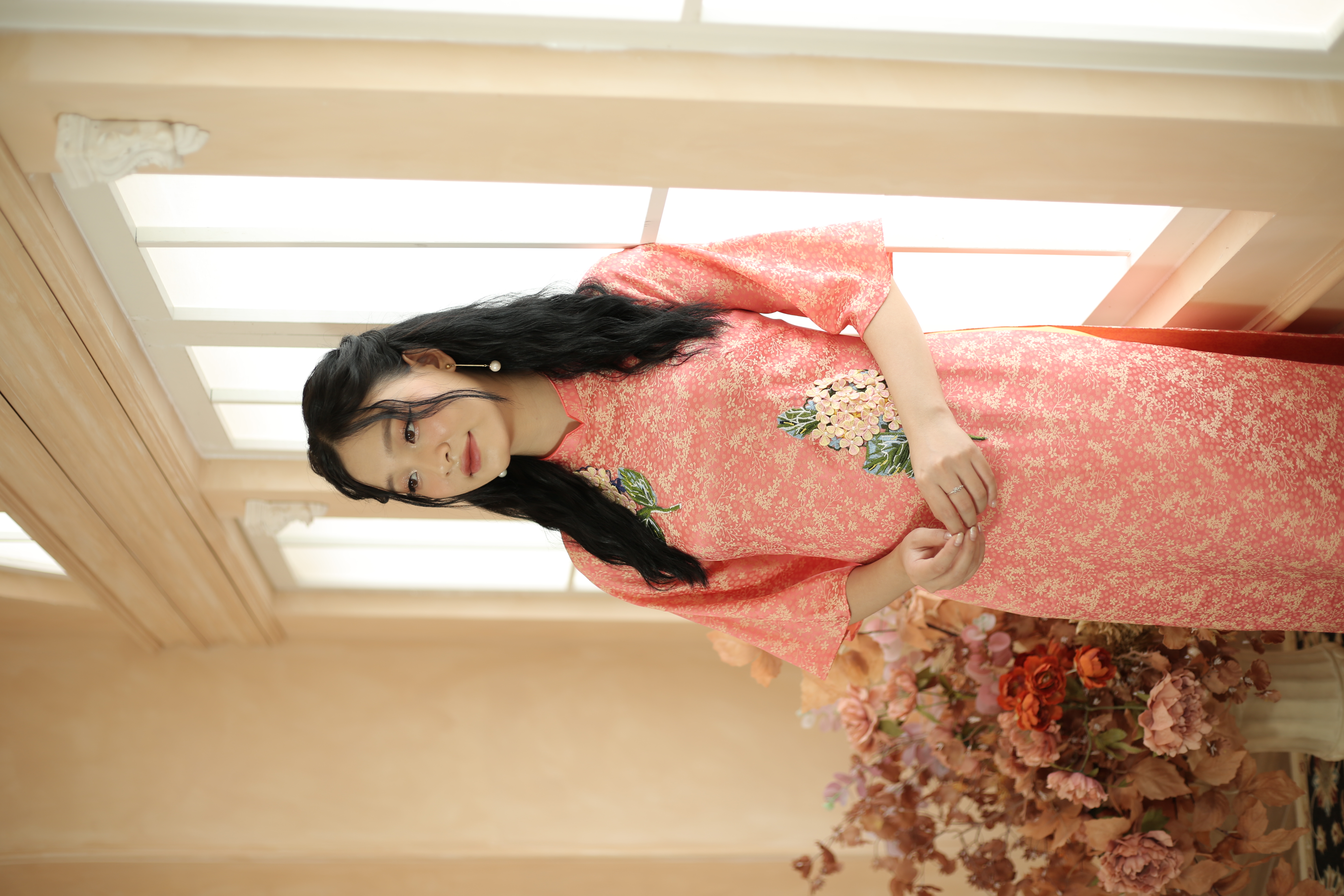 áo dài cách tân form suông được may bằng chất liệu lụa gấm loại 1 màu cam nhẹ nhàng, kết hoa thủ công, tay lỡ loe