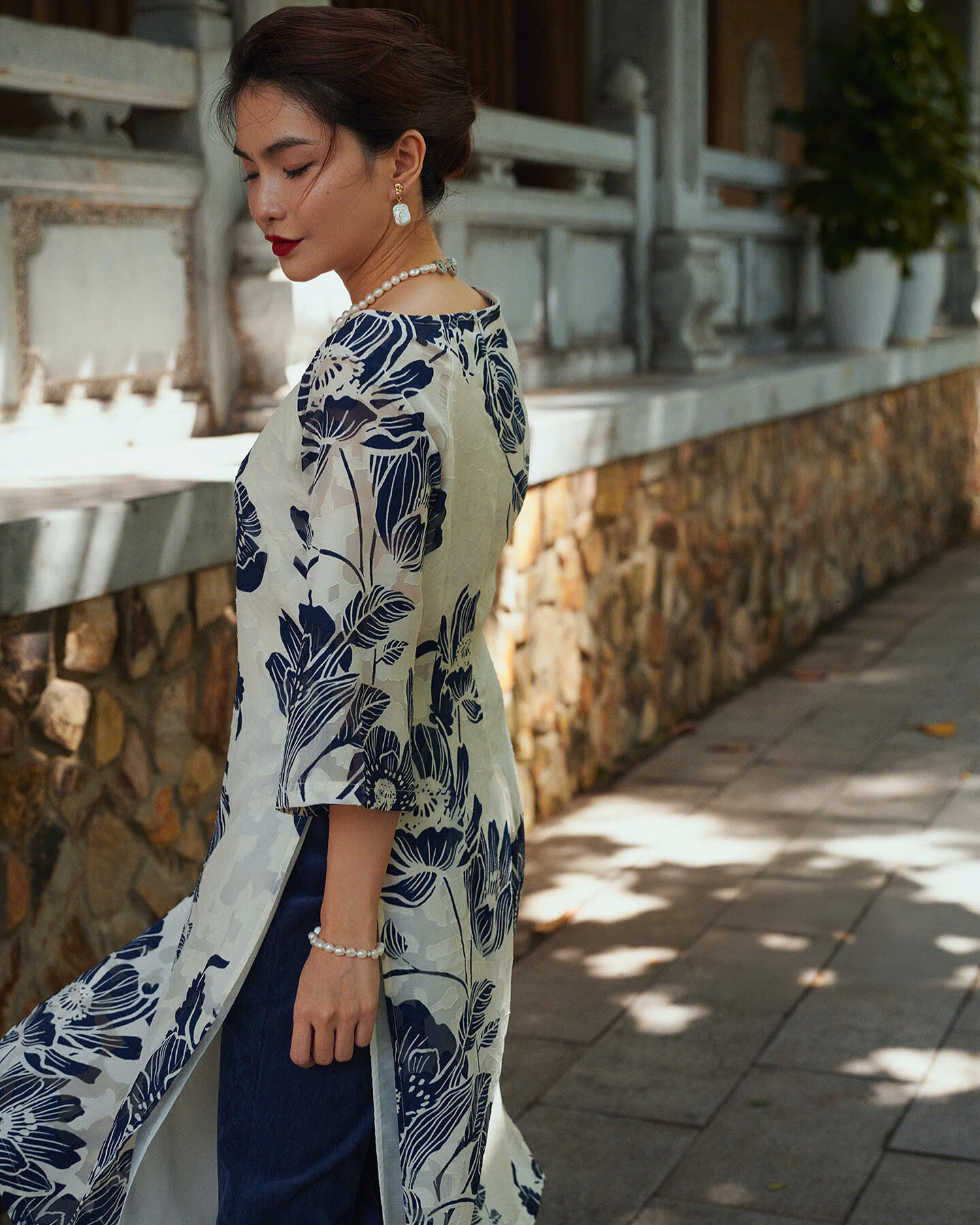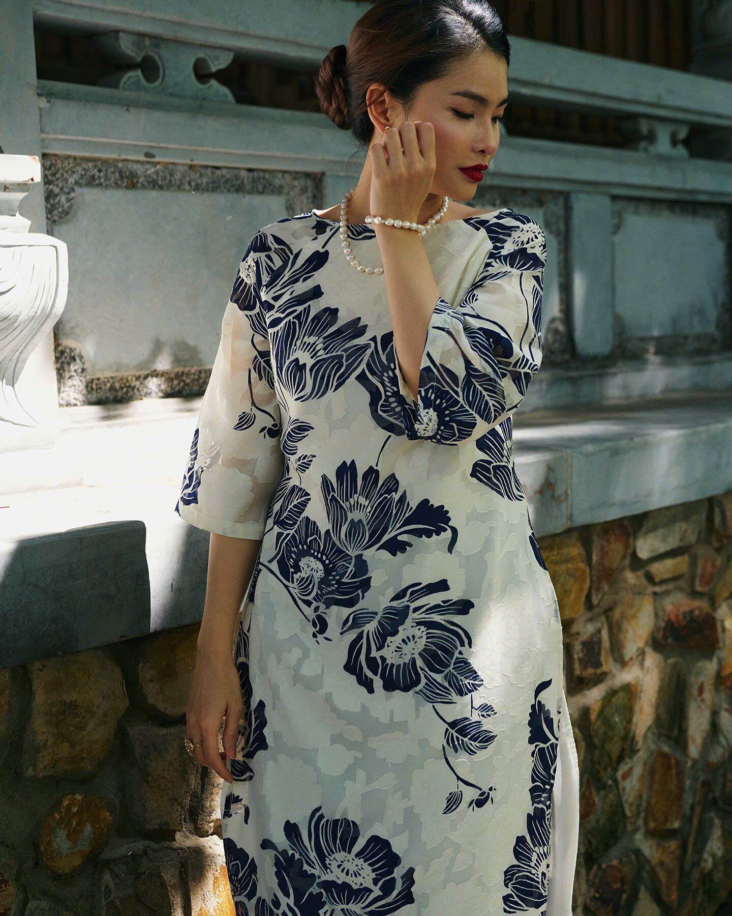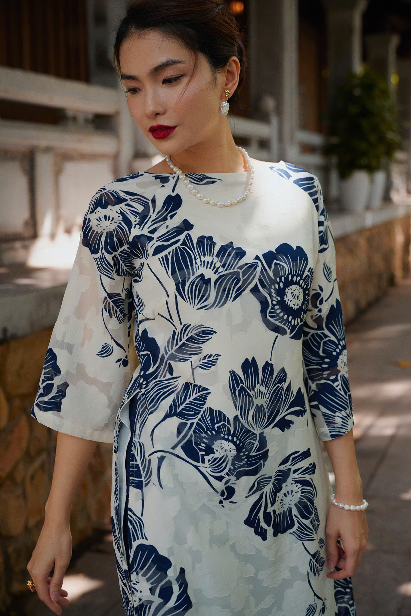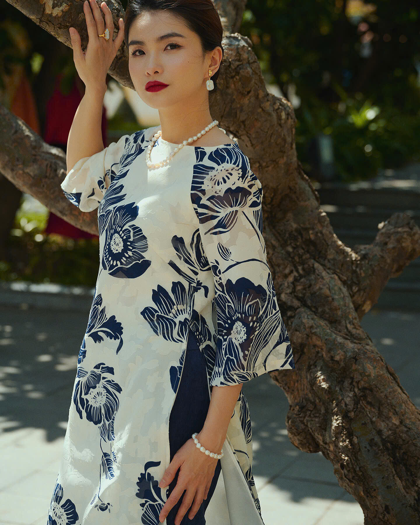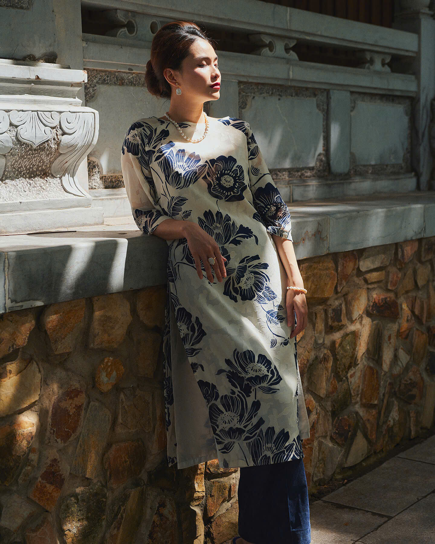 Mang phong cách truyền thống kết hợp với nét đương đại, chiếc áo dài Mẫu Đơn có thiết kế cổ thuyền mềm mại, giúp tôn lên vẻ đẹp duyên dáng và thanh lịch của người mặc. Họa tiết hoa mẫu đơn lớn với tone màu tương phản nổi bật trên nền vải trắng, tạo cảm giác sang trọng và cuốn hút. Chất liệu vải tơ ép hoa nhẹ nhàng, thoáng mát, phù hợp với khí hậu nhiệt đới. Đặc biệt, áo được may theo kỹ thuật 4 tà tạo sự chuyển động nhịp nhàng theo từng bước đi.