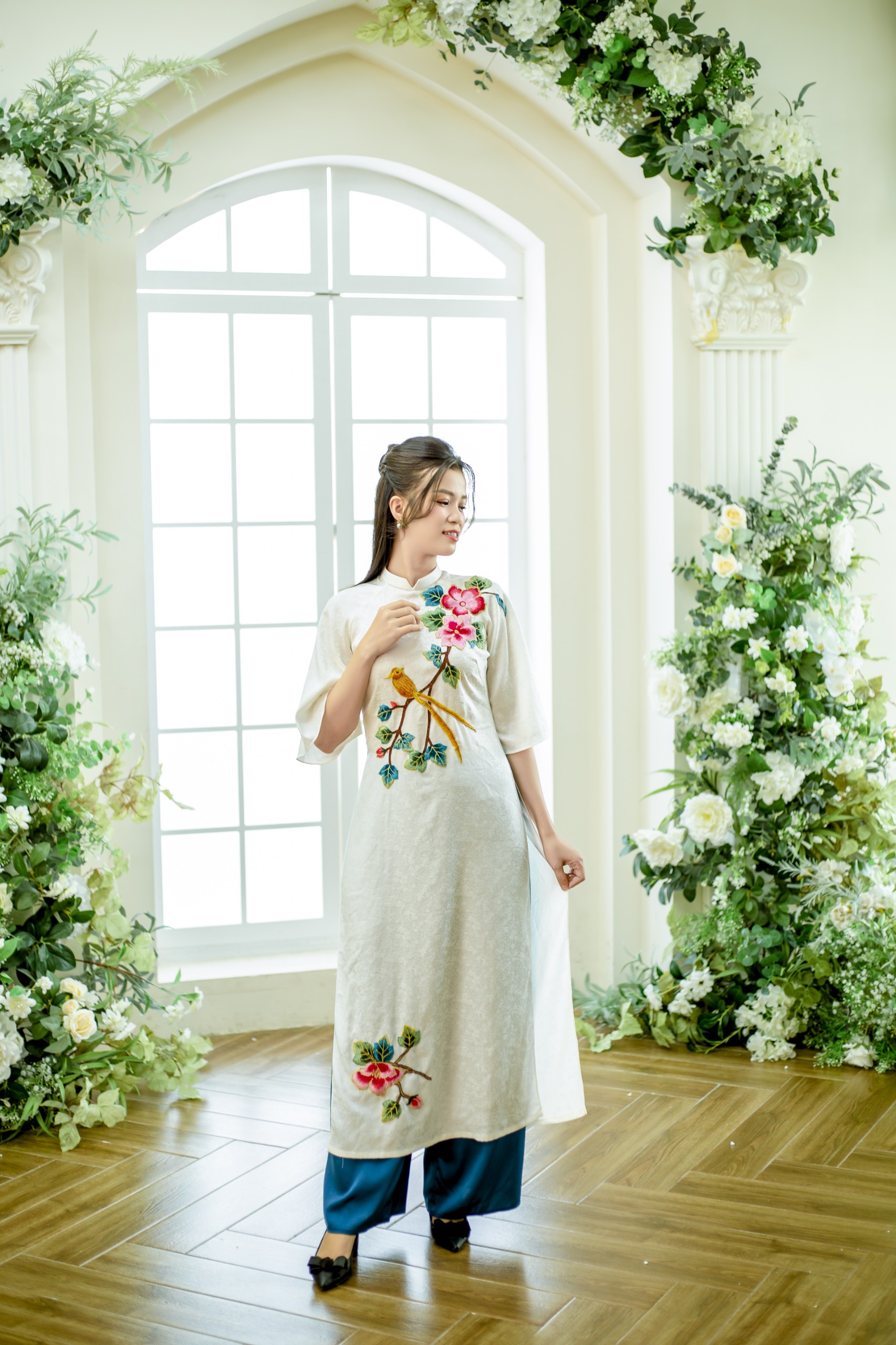 áo dài cách tân may bằng vải lụa gấm thượng hạng , đính kết hoa tỉ mỉ, quần xanh