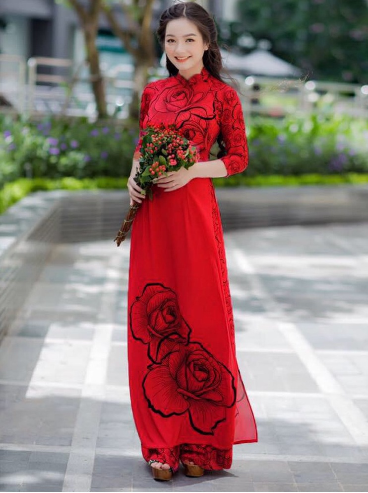 ÁO DÀI TRUYỀN THỐNG IN HOA HỒNG TẶNG CÀI TÓC XINH XẮN + chất liệu :LỤA NHẬT 3D CAO CẤP ( MỀM MẠI, MỊN, MÁT, CÓ ĐỘ RŨ TĂNG THÊM PHẦN DUYÊN DÁNG). + QUẦN