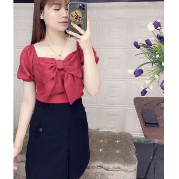 ✨Áo đũi ngắn tay thắt nơ cổ trễ tôn dáng