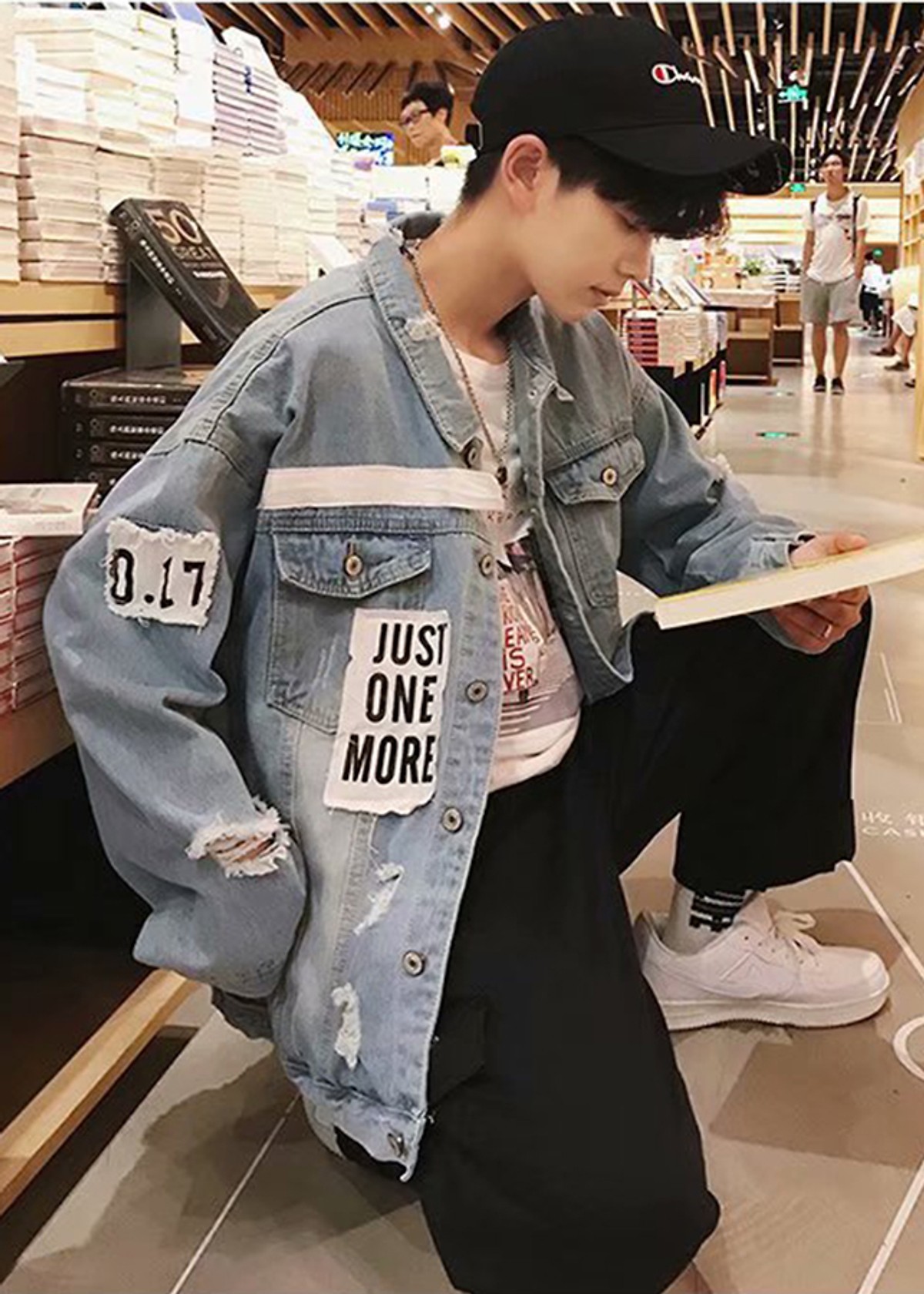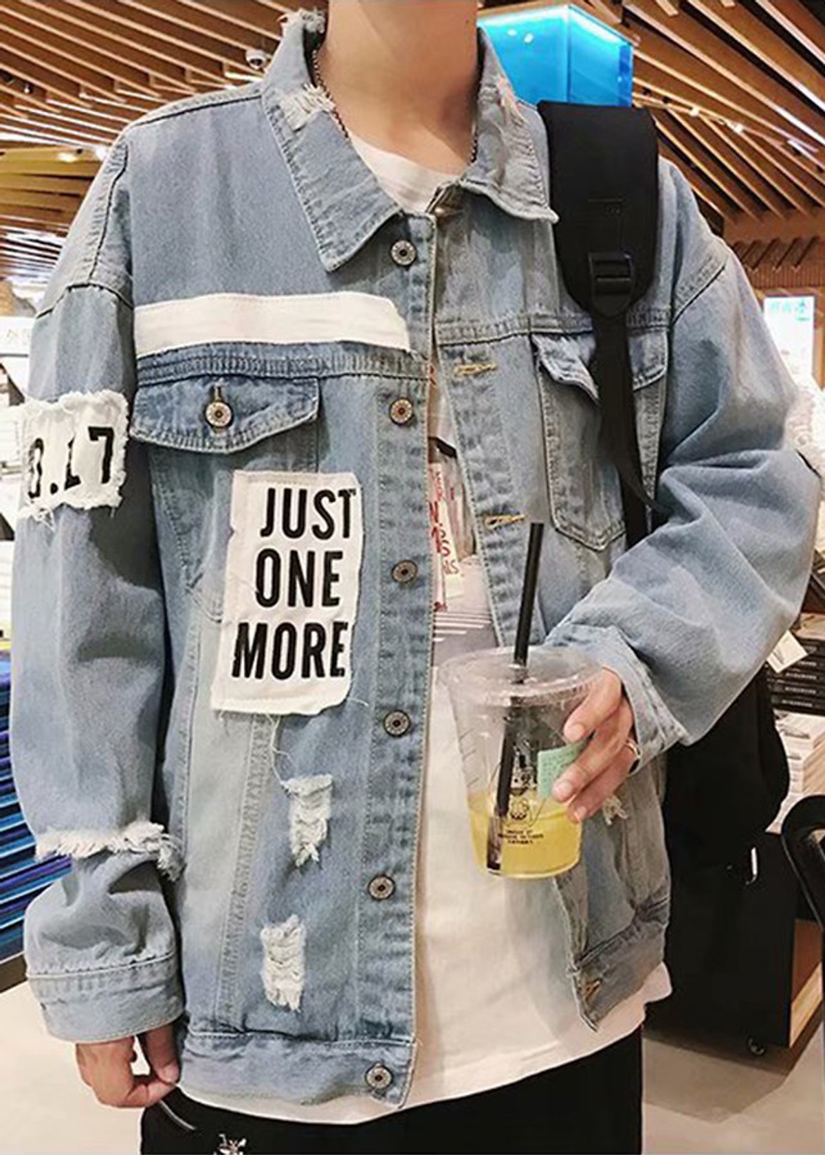 Áo khoác jeans xanh rách Uniex Just One More cực chất Chất Liệu: Vải Jean xịn mặc mát, form đẹp Size : S, M, L, XL, XXl Áo khoác jean form rộng Unisex nam nữ