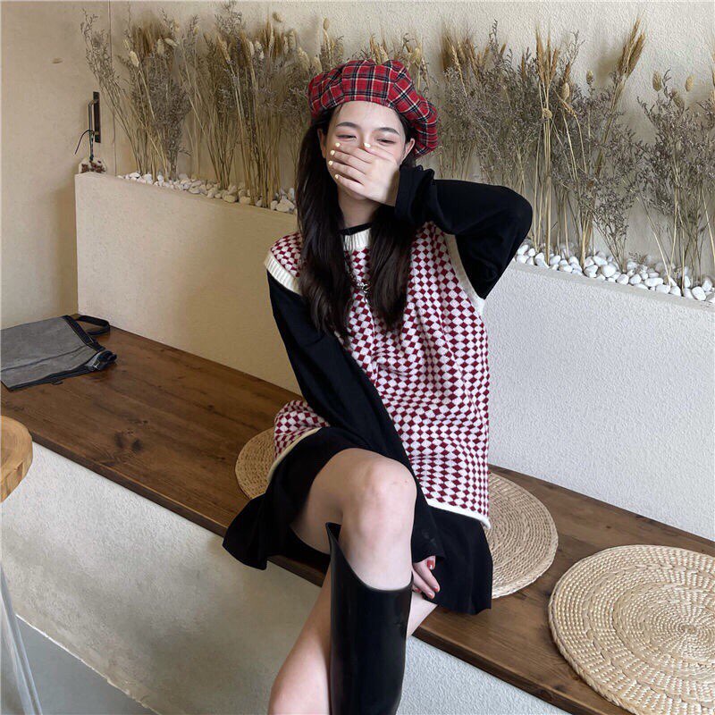 ✨Áo kiểu Dệt Kim Cổ Tròn Không Tay Họa Tiết Caro Thời Trang Cho Nữ