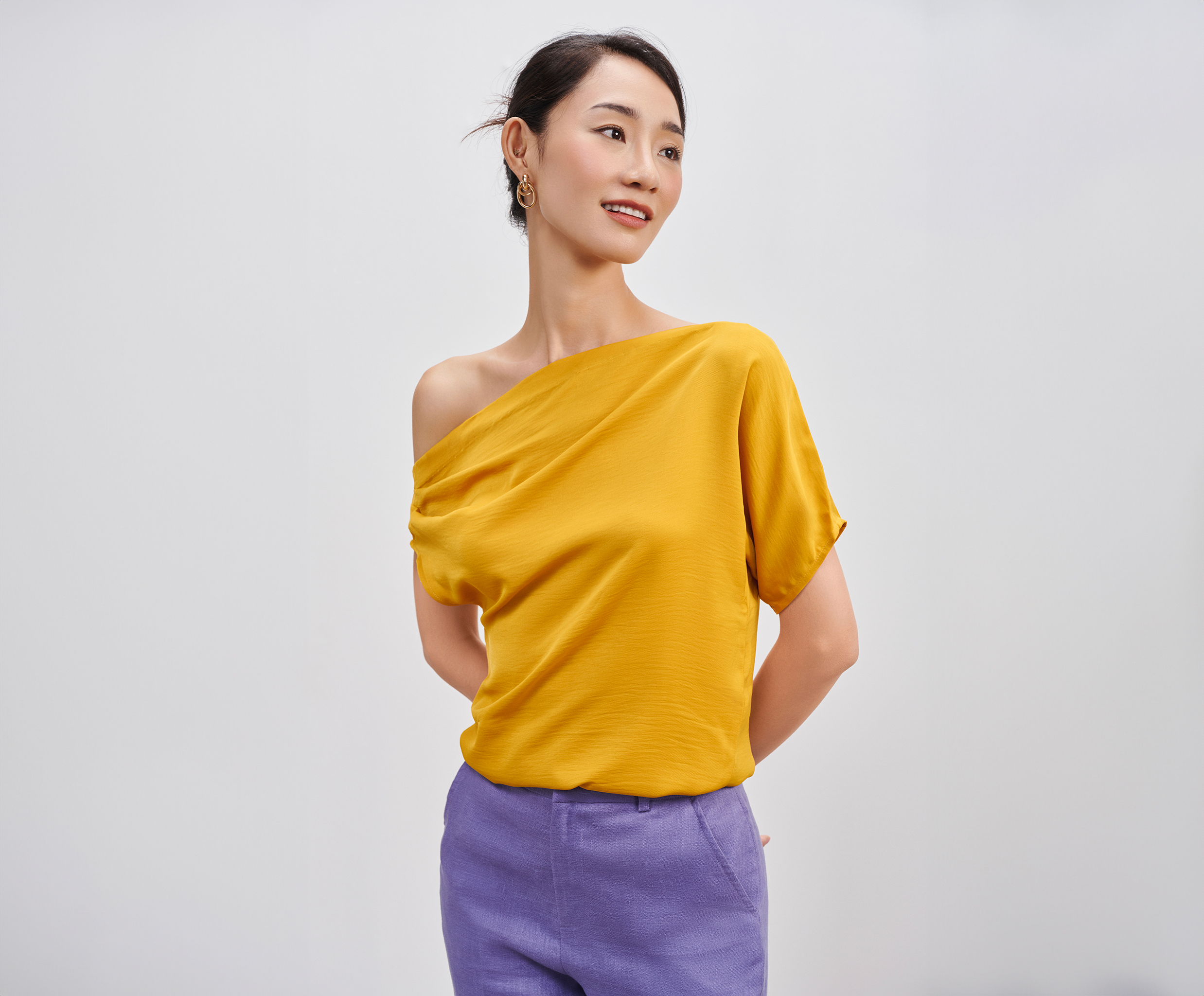 Áo kiểu lệch vai, 1 bên vai xếp ly, 1 bên vai rộng tay liền