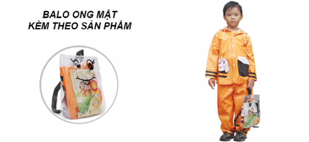 Kiểu dáng áo mưa nhỏ gọn, trẻ trung cùng họa tiết hình chú ong mật ngộ nghĩnh, đáng yêu, chắc chắn sẽ khiến các bé trai thích áo mưa này và không ngại mặc khi trời mưa. Sản phẩm có 3 màu sắc cho bạn dễ dàng lựa chọn cho bé: Cam - Xanh dương - Đỏ