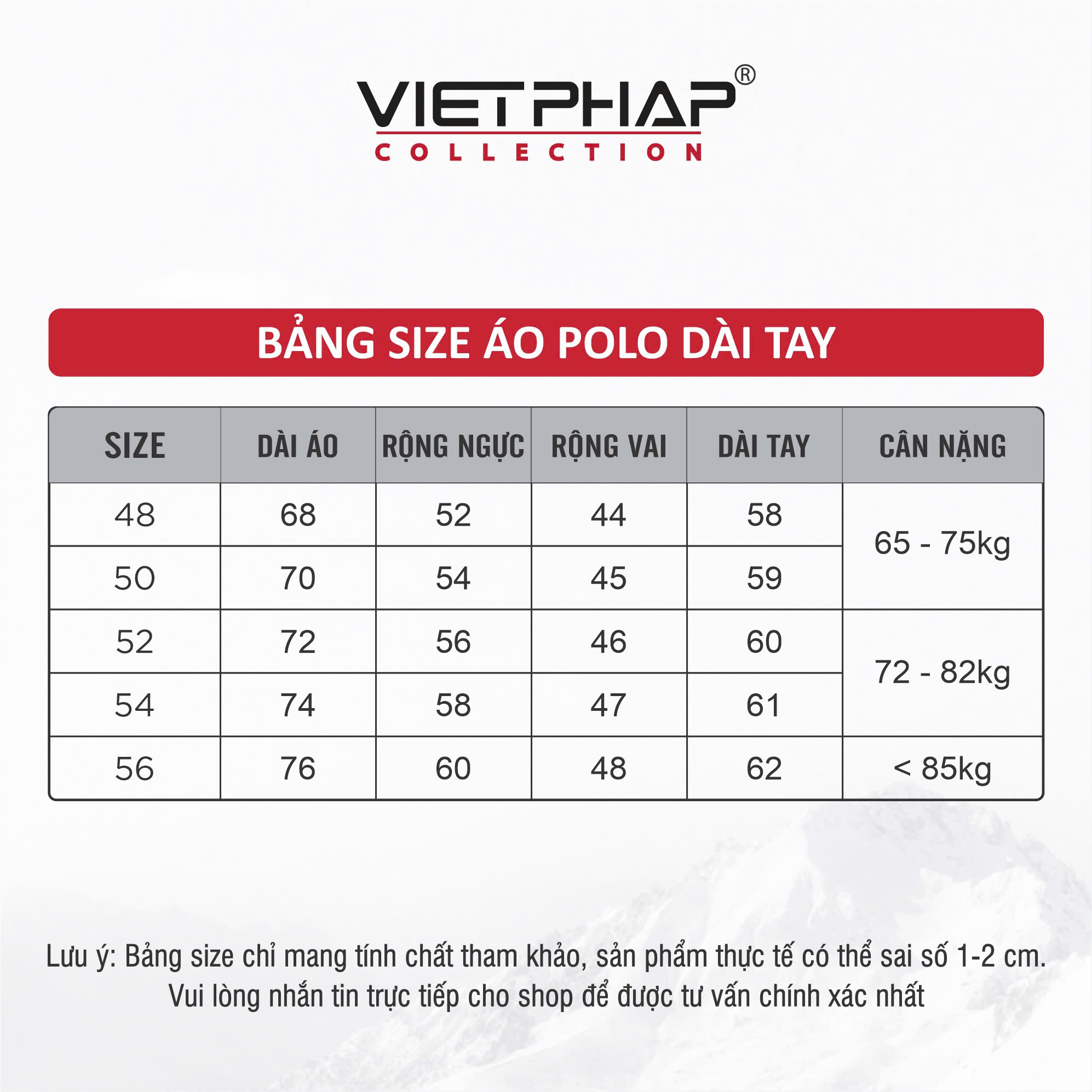 - Bảng size chart chỉ mang tính chất tham khảo, tùy thuộc vào số đo cơ thể mỗi người và chất liệu vải khác nhau sẽ có sự chênh lệch nhất định từ 1 - 2cm.