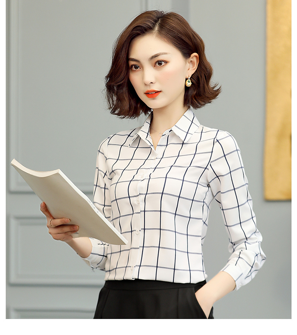Áo sơ mi nữ form rộng tay dài phồng phong cách trẻ trung hàn quốc : - Áo sơ mi form rộng tay dài trắng đen, xanh xám được làm bằng chất liệu LỤA ,