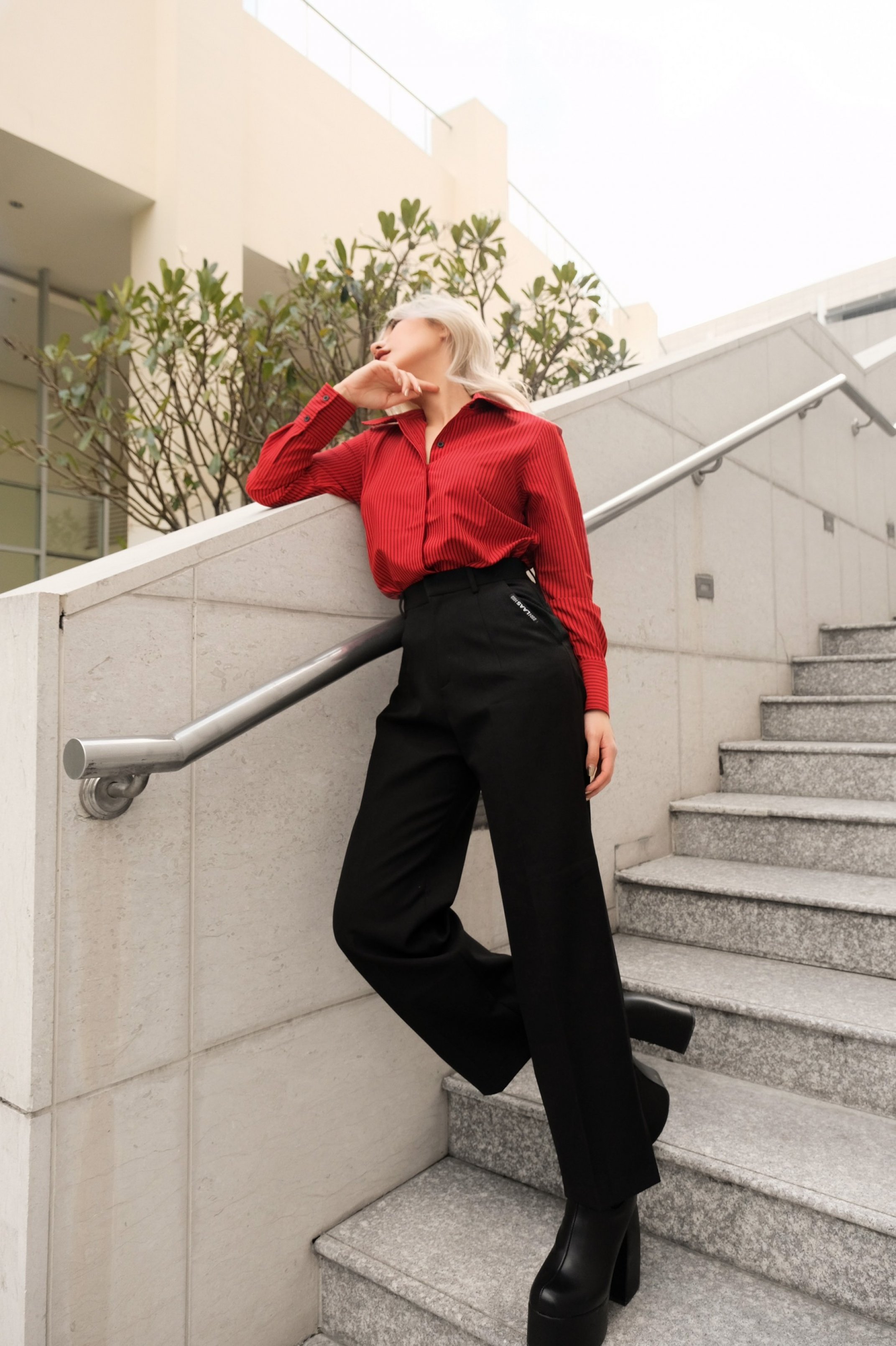 CHẤT SOMI COTTON PHA, ĐỨNG PHOM ÁO MÀU ĐỎ SỌC ĐEN ÁO CỔ SOMI, TAY DÀI, NẸP ÁO GIẤU NÚT PHOM CĂN BẢN SUÔN ĐIỂM NHẤN TAG LOGO NGAY NẸP ÁO
