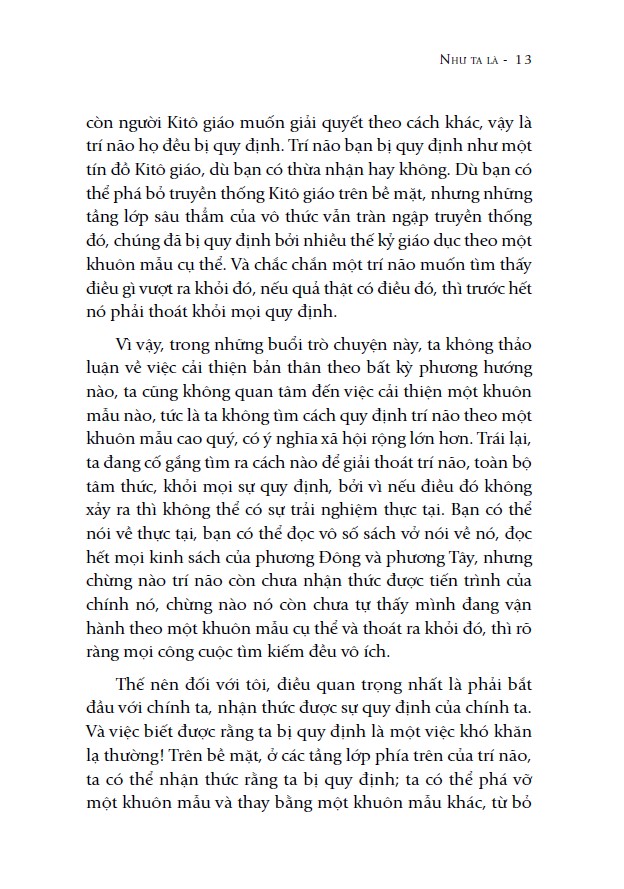 - Giải thoát tâm trí khỏi mọi sự quy định - Đã bao giờ bạn từng nghĩ, vì sao trên thế giới, có nơi chìm đắm trong nghèo khó nhưng cũng có nơi giàu có vô cùng? Vì sao những nỗ lực cải thiện bản thân, thôi thúc ta gặt hái thành công, lại đi kèm với những nỗi sợ hãi, thất bại và khổ đau? Theo triết gia Jiddu Krishnamurti, cấu trúc xã hội ngày nay được xây dựng dựa trên sự ganh tị, sự tích lũy, trong đó bao hàm sự tuân thủ, chấp nhận quyền lực, thỏa mãn tham vọng, mà về cốt lõi chính là cái “tôi”, cái bản ngã đang nỗ lực để trở thành điều gì đó. Xã hội được tạo nên từ chất liệu đó và nền văn hóa của nó – vui và khổ, đẹp và xấu, toàn bộ những nỗ lực của xã hội – quy định trí não con người. Vậy làm thế nào để tâm trí chúng ta thoát khỏi tất cả sự quy định này? Câu trả lời sẽ được tìm thấy trong quyển sách “Như ta là” (tựa gốc: “As One Is”) của Krishnamurti. Quyển sách tường thuật nội dung tám buổi nói chuyện có tính ngẫu hứng của Krishnamurti trước hàng trăm người, diễn ra dưới bóng râm của một rừng sồi nhỏ nơi thung lũng Ojai (California, Hoa Kỳ) vào mùa hè năm 1955. Tại đây, Krishnamurti đã dẫn dắt người nghe nhìn thẳng vào sự hỗn loạn, những thói quen và tư tưởng của một trí não bị ảnh hưởng bởi mọi sự quy định, đồng thời khám phá ra rằng đây là gốc rễ của mọi bạo lực cũng như khổ đau trên toàn thế giới. Xuyên suốt tác phẩm, Krishnamurti nhấn mạnh con đường duy nhất để khám phá ra sự thật cốt lõi của tất cả những điều trên, đi đến sự giải thoát, là tự biết mình; thấy chính ta như “ta là” trong thực tại, chứ không phải “ta phải là” hay “ta nên là”. Ông chỉ ra rằng bằng cách tự nhìn thấy trí não của mình đang bị chi phối ra sao bởi những uy quyền, khuôn khổ, phạm vi, truyền thống, quy định…, con người mới có thể thoát ra khỏi tất cả những điều đó. Một cách rốt ráo, Krishnamurti yêu cầu người nghe xem xét để nhận ra rằng tất cả mọi biểu hiện có vẻ tiến bộ của bản ngã không phải là sự tiến bộ dẫn đến tự do mà chỉ là guồng quay cũ của ảo tưởng; rằng sự hiểu biết trí não của chính mình, tự biết mình là con đường duy nhất dẫn đến tự do. Ông can đảm đối diện với những vấn đề thiết yếu của xã hội và dẫn dắt người nghe nhìn nhận chúng bằng minh triết để tự mình thấu hiểu, khám phá mọi sự thật bằng một tâm thức tự do hoàn toàn. Trong “Như ta là”, Krishnamurti đã lần lượt đề cập đến những vấn đề cốt lõi như: bản chất của bạo lực, vấn đề thay đổi, sự quy định của trí não, nền hòa bình thực sự, bản chất của sự sùng bái, sự tu tập tâm linh, và thế nào là thực sự lắng nghe… Ông cũng giúp cử tọa giải đáp một số thắc mắc “tại chỗ” như: dục vọng; tình trạng phạm tội ở tuổi thanh thiếu niên; bản chất của sự nhiễu loạn trong tâm trí; ý nghĩa, mục đích sống; việc nuôi dạy con cái; sự tái Với lối tiếp cận vấn đề một cách trực diện, Krishnamurti đã phơi bày tận căn nguyên gốc rễ của vấn đề, đồng thời hướng dẫn người nghe thấu hiểu cách chúng ăn sâu vào tiềm thức của chúng ta, ngăn trở ta tìm ra sự thật. Với ngôn từ giản dị, cách tiếp cận trực diện cùng những lập luận thuyết phục vốn có của Krishnamurti, “Như ta là” mang đến cho người đọc những kiến thức khai sáng đầy thông tuệ, những nhận thức mới mẻ về mặt tâm linh. Những điều suy nghiệm này tuy đã được nói ra từ hơn nửa thế kỷ trước nhưng vẫn chứa đựng những giá trị mới mẻ và thiết thực đối với thế giới cho đến ngày hôm nay. Khép lại cuốn sách, hy vọng mỗi người có thể tự tìm ra cho mình những sự thật bên trong bằng sự chú tâm trọn vẹn và quan sát chính mình từng phút giây. “Như ta là” chính là hành trang không thể thiếu cho tất cả những ai thực sự nghiêm túc trên con đường tìm kiếm hiểu biết tâm linh qua những lời dạy của Krishnamurti. Về tác giả: Jiddu Krishnamurti (1895 – 1986) là một triết gia, nhà diễn thuyết nổi tiếng về các vấn đề triết học và tinh thần, xoay quanh các chủ đề bao gồm: mục đích của thiền định, mối quan hệ giữa con người và phương cách để tạo nên sự thay đổi tích cực cho xã hội. Sinh ra trong một gia đình thuộc tầng lớp Brahmin tại Ấn Độ, nhưng Krishnamurti khẳng định rằng mình không thuộc bất cứ quốc tịch, tầng lớp, tôn giáo hay trường phái triết học nào. Ông dành suốt quãng đời còn lại của mình đi khắp thế giới như một nhà diễn thuyết độc lập. Krishnamurti không lệ thuộc vào bất kỳ tôn giáo, giáo phái, hay quốc gia nào. Ông cũng không tán thành bất kỳ trường phái tư tưởng thuộc học thuyết hay chính trị nào. Trái lại, ông quả quyết rằng những trường phái này chính là yếu tố phân chia con người với con người và tạo ra xung đột, cũng như chiến tranh. Lời dạy của ô