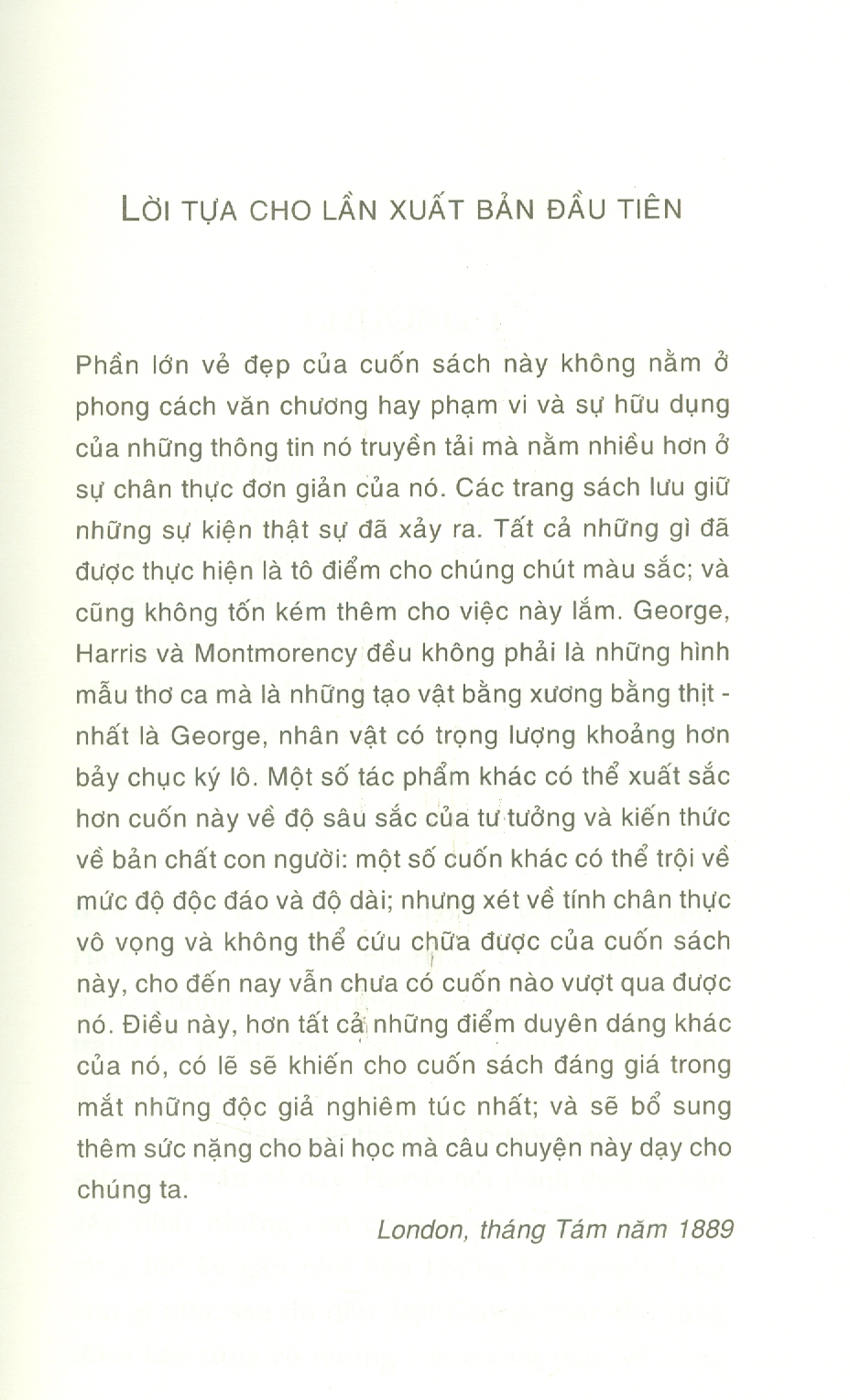 Bọn hắn có bốn mạng (tính cả con chó), và bọn hắn tiến hành chuyến du hành sông Thames để đời này với một lý do chính đáng không để đâu cho hết: để thư giãn. Quả thật, nếu không tính đến sự cứng đầu cứng cổ của mớ hành lý, sự vô ơn của con thuyền, sự quỷ quyệt của cái ấm trà, sự om sòm của bầy thiên nga ( và ) thì ái chà, bọn hắn quả đã được thư giãn thật. Thêm vào đó, bọn hắn còn được biết thế nào là một chuyến du hành đích thực…