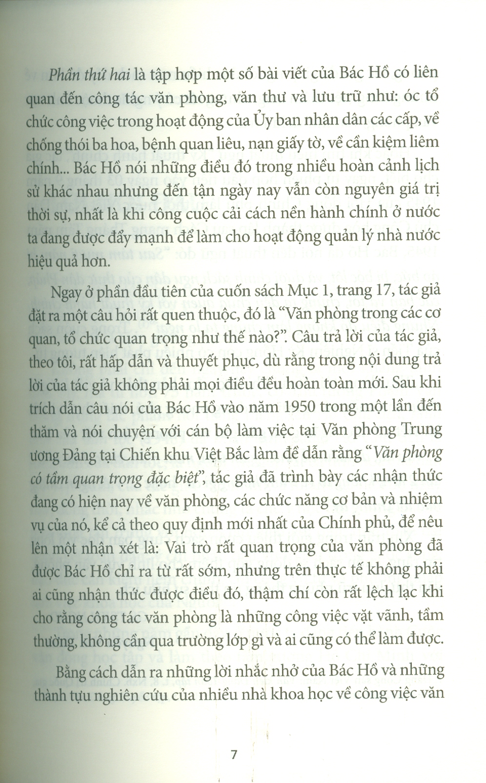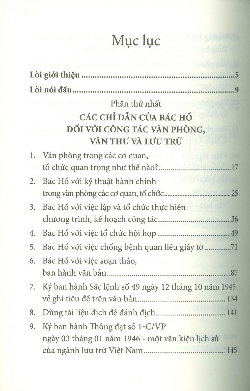 Bác Hồ với công tác văn phòng, văn thư và lưu trữ Cuốn sách này gồm 2 phần: Phần thứ nhất, từ những chỉ dẫn trong nhiều bài viết của Bác Hồ, được tác giả lựa chọn một cách kỹ lưỡng và lần lượt phân tích, làm sáng tỏ những nội dung cơ bản của công tác văn phòng, văn thư, lưu trữ mà những người được phân công làm công việc này trong các cơ quan Đảng, Nhà nước cũng như các doanh nghiệp đều cần nắm vững. Phần thứ hai là tập hợp một số bài viết của Bác Hồ có liên quan đến công tác văn phòng, văn thư và lưu trữ như: óc tổ chức công việc trong hoạt động của Ủy ban nhân dân các cấp, về chống thói ba hoa, bệnh quan liêu, nạn giấy tờ, về cần kiệm liêm chính… Bác Hồ nói những điều đó trong nhiều hoàn cảnh lịch sử khác nhau nhưng đến tận ngày nay vẫn còn nguyên giá trị thời sự, nhất là khi công cuộc cải cách nền hành chính ở nước ta đang được đẩy mạnh để làm cho hoạt động quản lý nhà nước hiệu quả hơn. Bằng cách dẫn ra những lời nhắc nhở của Bác Hồ và những thành tựu nghiên cứu của nhiều nhà khoa học về công việc văn phòng, tác giả đã giúp người đọc hiểu một cách đầy đủ hơn về những công việc thầm lặng, nhưng rất có ý nghĩa thuộc lĩnh vực văn phòng, văn thư và lưu trữ.