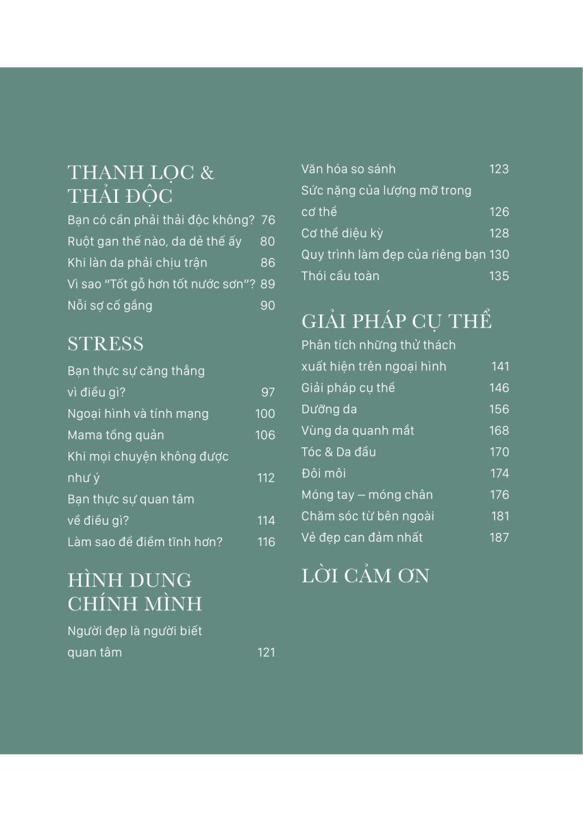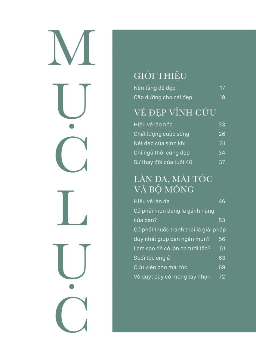 Cuốn sách sẽ dẫn dắt bạn vào một cuộc hành trình định hình lại cách tiếp cận với cái đẹp, giúp bạn biết trân trọng bản thân và hướng dẫn bạn cách đưa ra những lựa chọn tỉnh táo để có diện mạo và cảm xúc tốt nhất – ở bất kỳ độ tuổi nào.