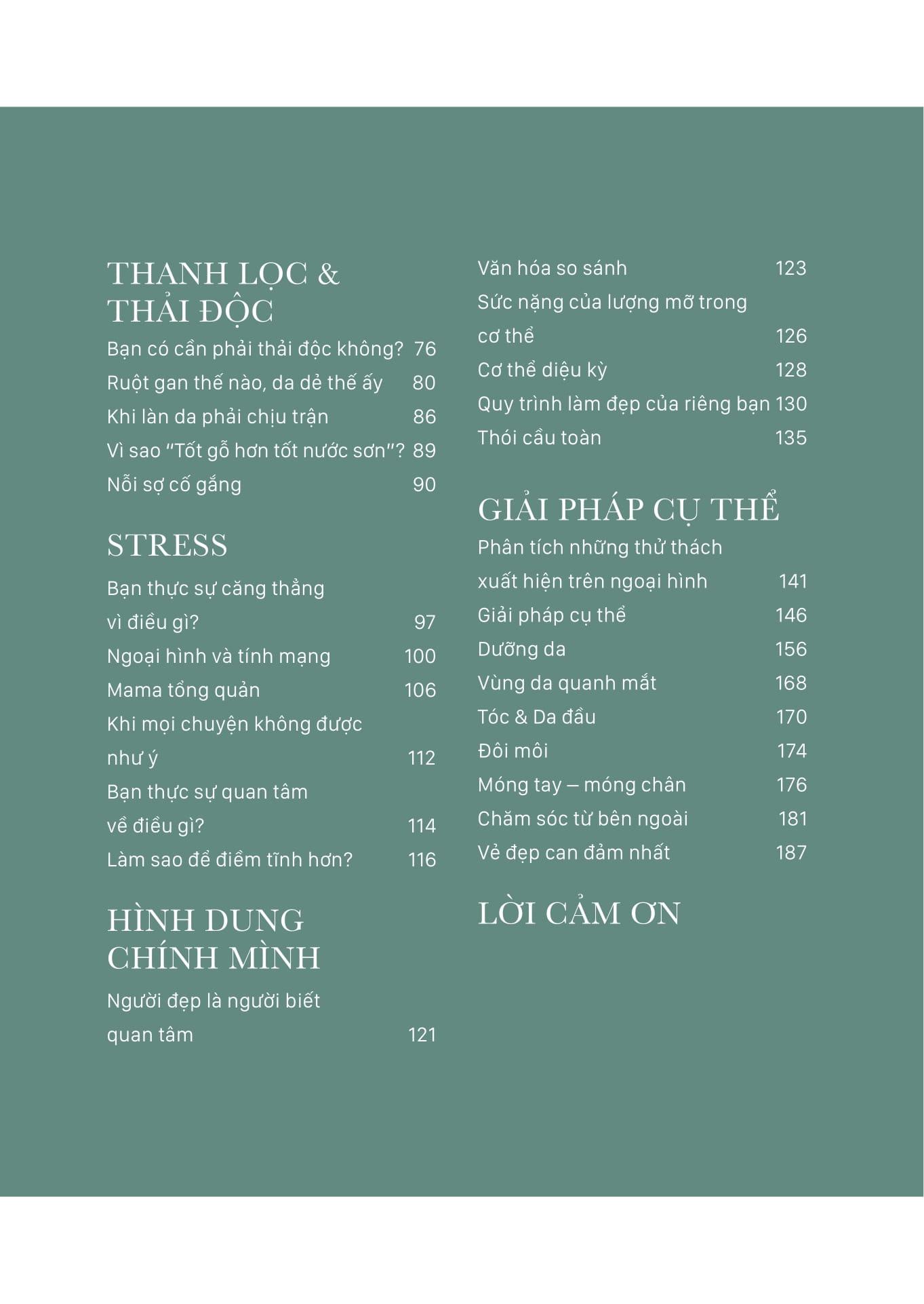 Cuốn sách sẽ dẫn dắt bạn vào một cuộc hành trình định hình lại cách tiếp cận với cái đẹp, giúp bạn biết trân trọng bản thân và hướng dẫn bạn cách đưa ra những lựa chọn tỉnh táo để có diện mạo và cảm xúc tốt nhất – ở bất kỳ độ tuổi nào.