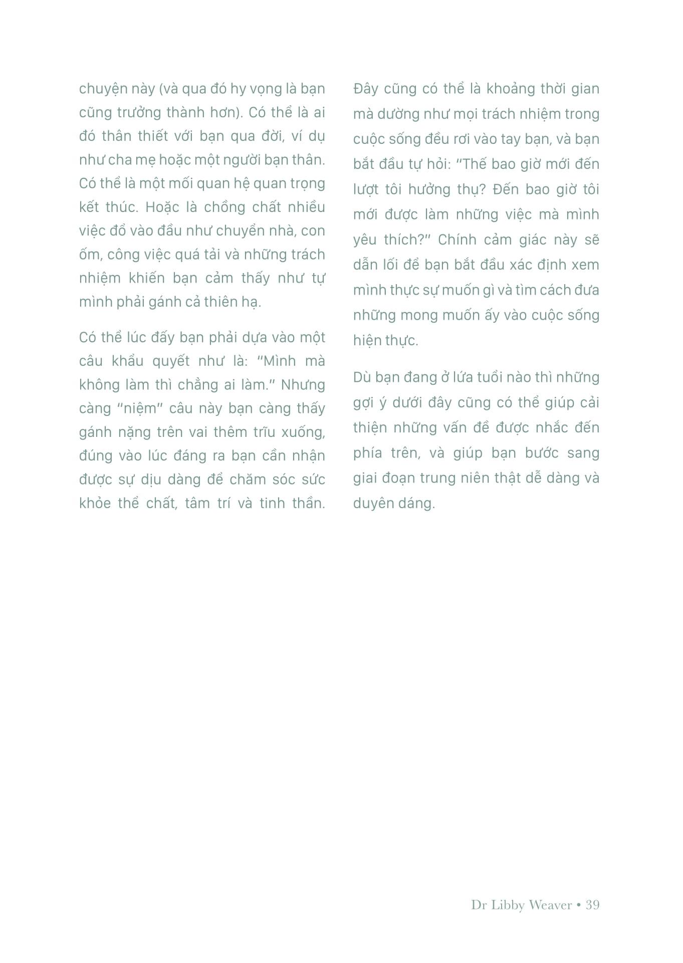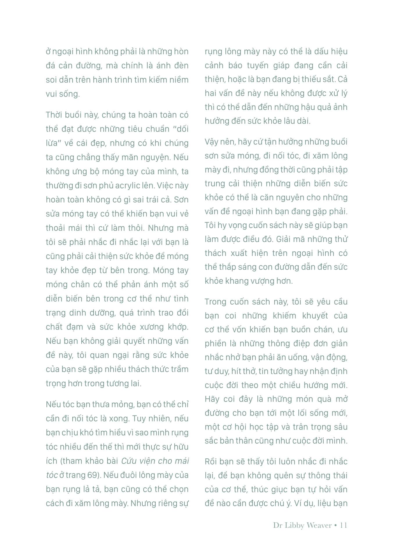 “Đa số mọi người phải trải qua những cuộc khủng hoảng thể chất, bị chẩn đoán có bệnh tật cụ thể, hoặc chất lượng cuộc sống suy giảm rõ rệt thì mới thực sự rút ra bài học là nếu không có sức khỏe thì chúng ta chẳng có gì hết. Nhưng tôi không muốn dọa nạt kiểu đấy để khuyên bạn bắt đầu chăm sóc cho bản thân. Tôi muốn bạn kết nối lại với sự diệu kỳ của cơ thể và có ý thức chăm sóc sức khỏe khi bạn tự nhận ra rằng, cuộc đời này chính là một món quà quý giá. Hãy học cách giải mã những tín hiệu từ cơ thể và hành động để cải thiện cơ thể tốt hơn và từ đó dành sự chăm sóc tương xứng cho bộ Thiên Phục (tôi thân thương gọi cơ thể chúng ta bằng từ đó) được ban tặng.”