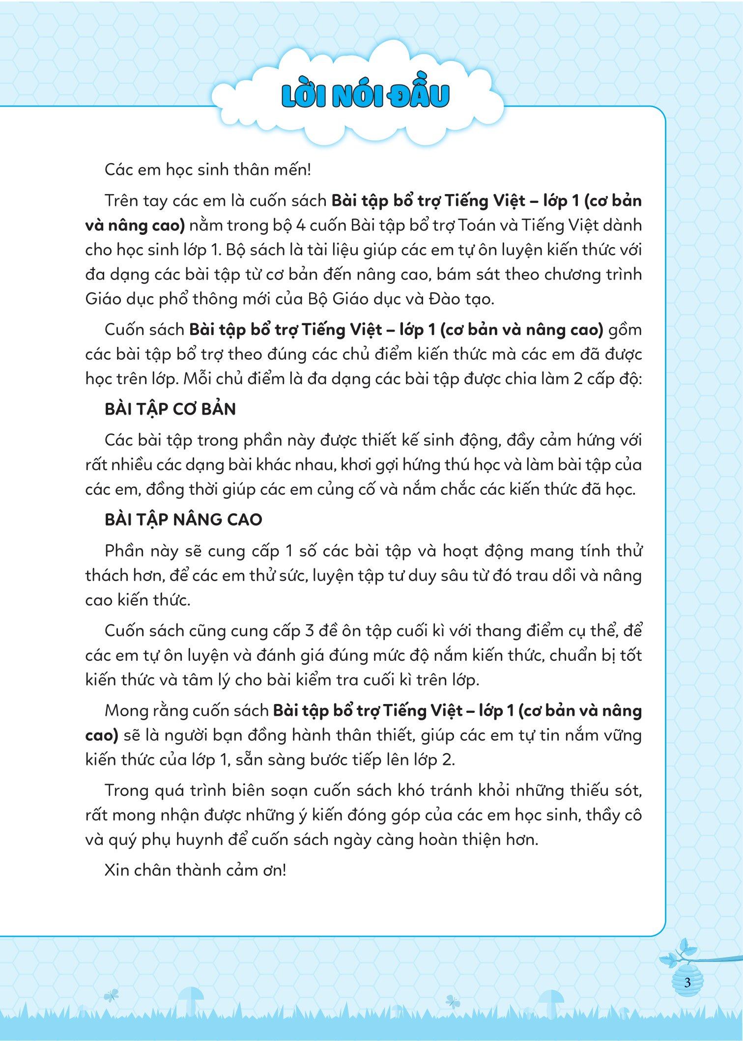 - Đáp án chi tiết, rõ ràng Phần đáp án chi tiết ở cuối sách giúp phụ huynh và các con có thể tự đối chiếu và đánh giá sau khi hoàn thành bài tập, từ đó có phương pháp ôn luyện phù hợp cho con. Mong rằng cuốn sách Bài tập bổ trợ Tiếng Việt cơ bản và nâng cao Lớp 1 Tập 1 sẽ là người bạn đồng hành thân thiết, giúp các em tự tin nắm vững kiến thức của lớp 1, sẵn sàng bước tiếp lên lớp 2.