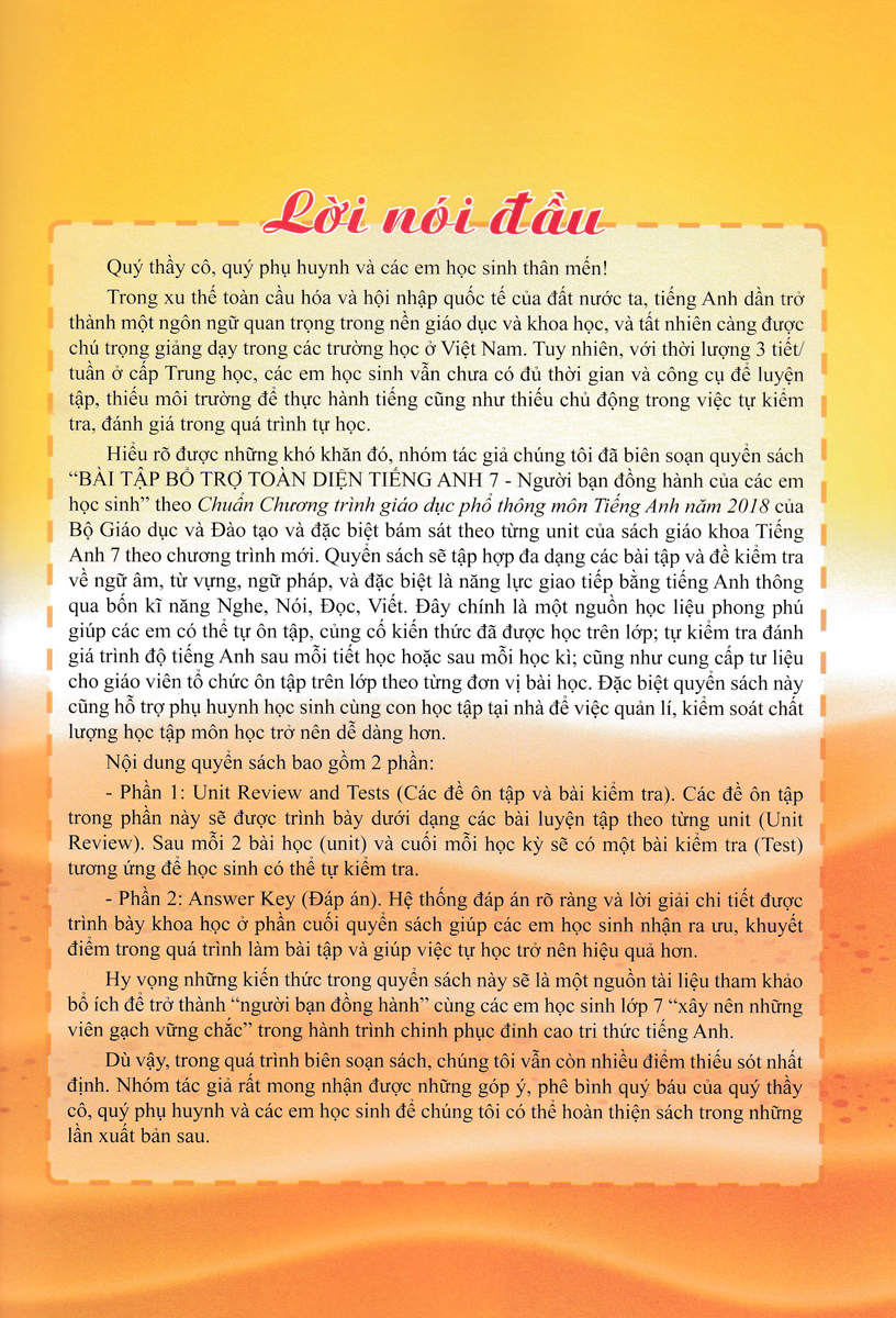 Bài Tập Bổ Trợ Toàn Diện Tiếng Anh 7 - Người bạn đồng hành của các em học sinh” theo Chuẩn Chương trình giáo dục phổ thông môn Tiếng Anh năm 2018 của Bộ Giáo dục và Đào tạo và đặc biệt bám sát theo từng unit của sách giáo khoa Tiếng Anh 7 theo chương trình mới. Quyển sách sẽ tập hợp đa dạng các bài tập và đề kiểm tra về ngữ âm, từ vựng, ngữ pháp, và đặc biệt là năng lực giao tiếp bằng tiếng Anh thông qua bốn kĩ năng Nghe, Nói, Đọc, Viết.