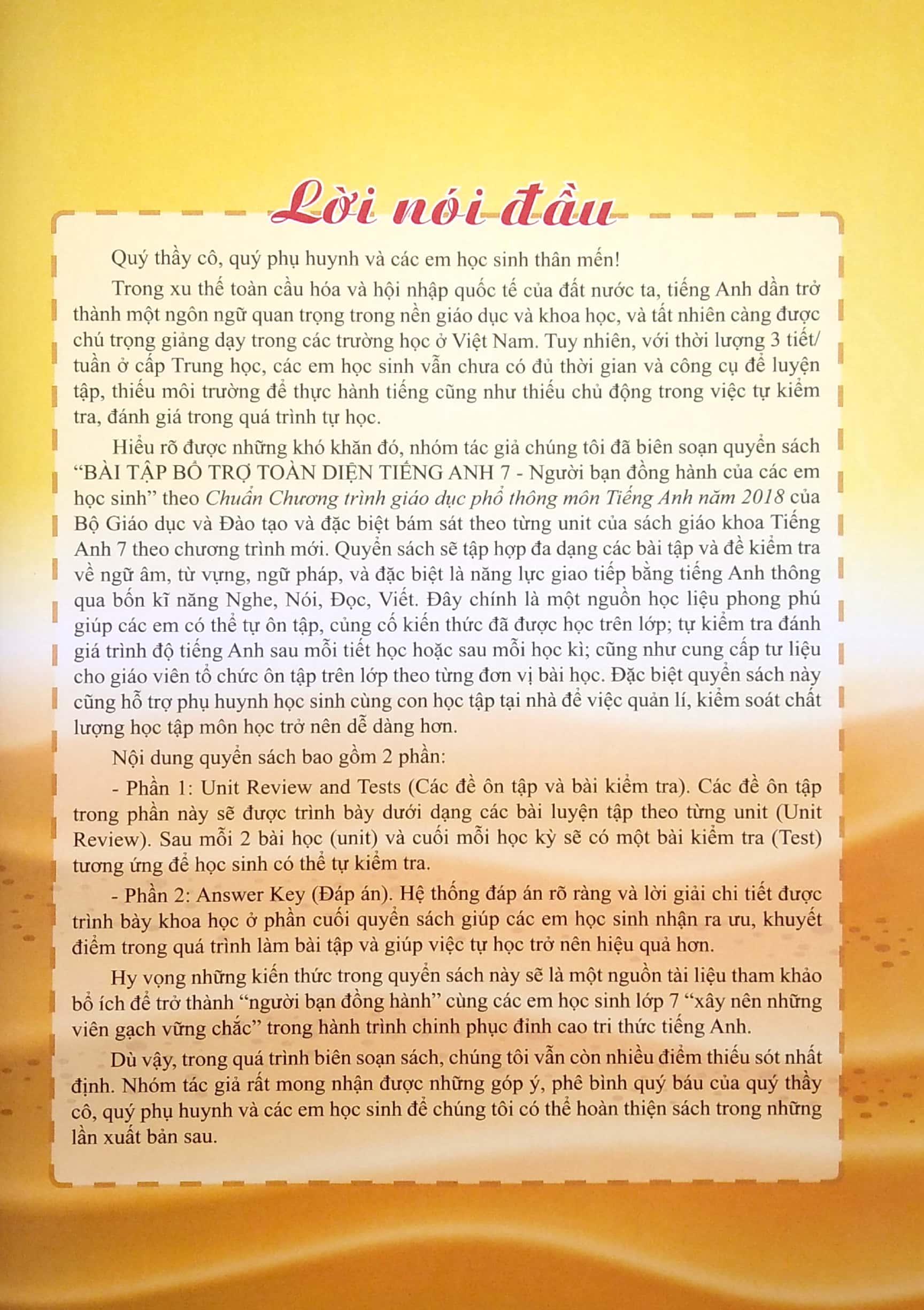 Hiểu rõ được những khó khăn đó, nhóm tác giả chúng tôi đã biên soạn quyển sách “BÀI TẬP BỎ TRỢ TOÀN DIỆN TIẾNG ANH 7 - Người bạn đồng hành của các em học sinh theo Chuẩn Chương trình giáo dục phổ thông môn Tiếng Anh năm 2018 của Bộ Giáo dục và Đào tạo và đặc biệt bám sát theo từng unit của sách giáo khoa Tiếng Anh 7 theo chương trình mới. Quyển sách sẽ tập hợp đa dạng các bài tập và đề kiểm tra về ngữ âm, từ vựng, ngữ pháp, và đặc biệt là năng lực giao tiếp bằng tiếng Anh thông qua bốn kĩ năng Nghe, Nói, Đọc, Viết. Đây chính là một nguồn học liệu phong phú giúp các em có thể tự ôn tập, củng cố kiến thức đã được học trên lớp; tự kiểm tra đánh giá trình độ tiếng Anh sau mỗi tiết học hoặc sau mỗi học kì; cũng như cung cấp tư liệu cho giáo viên tổ chức ôn tập trên lớp theo từng đơn vị bài học. Đặc biệt quyển sách này cũng hỗ trợ phụ huynh học sinh cùng con học tập tại nhà để việc quản lí, kiểm soát chất lượng học tập môn học trở nên dễ dàng hơn.