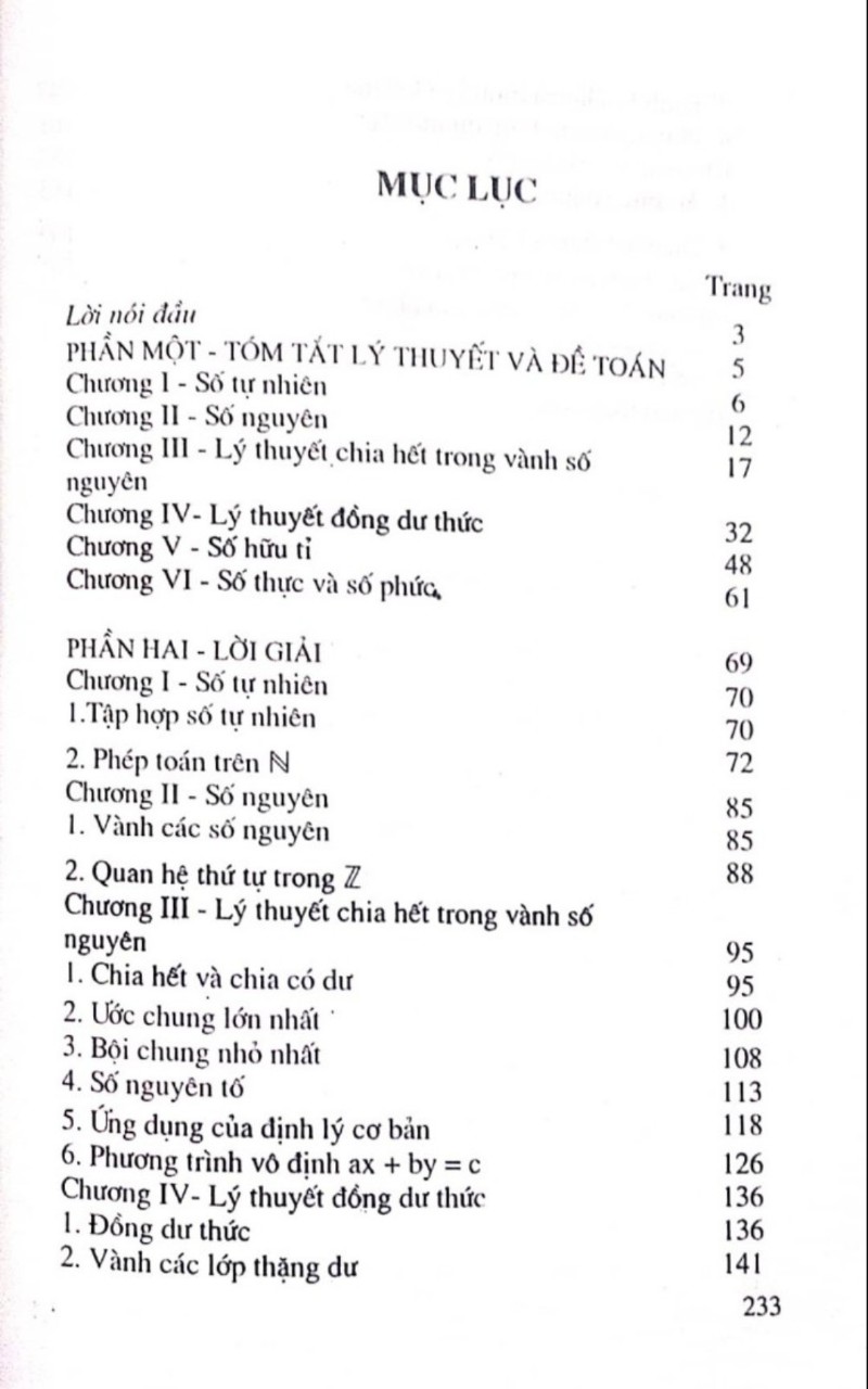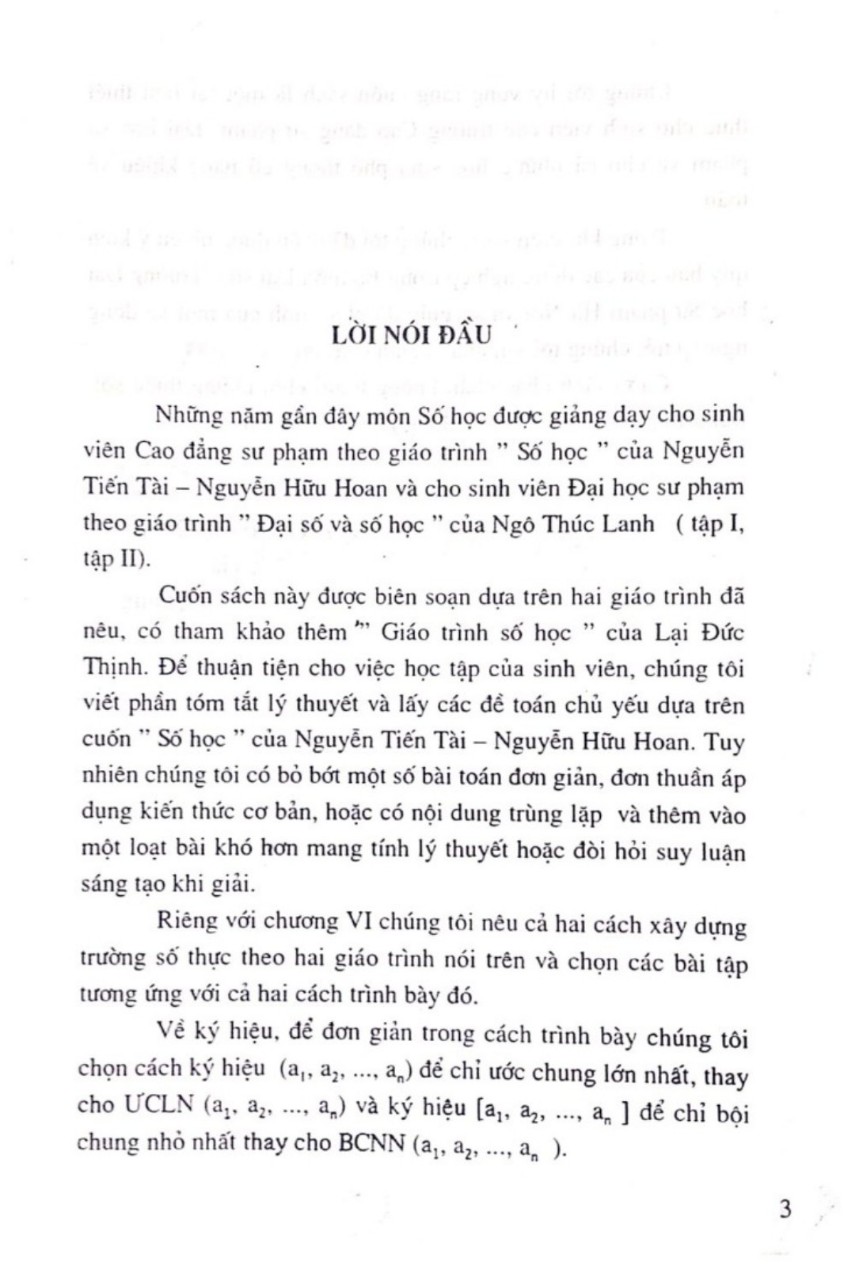 Những năm gần đây món Số học được giảng dạy cho sinh viên Cao đẳng sư phạm theo giáo trình ” Số học " của Nguyễn Tiến Tài – Nguyễn Hữu Hoan và cho sinh viên Đại học sư phạm theo giáo trình " Đại số và số học ” của Ngô Thúc Lanh ( tập I , tập II ) . Cuốn sách này được biên soạn dựa trên hai giáo trình đã nêu , có tham khảo thêm ” Giáo trình số học ” của Lại Đức Thịnh . Để thuận tiện cho việc học tập của sinh viên , chúng tôi viết phần tóm tắt lý thuyết và lấy các đề toán chủ yếu dựa trên cuốn " Số học ” của Nguyễn Tiến Tài – Nguyễn Hữu Hoan . Tuy nhiên chúng tôi có bỏ bớt một số bài toán đơn giản , đơn thuần áp dụng kiến thức cơ bản , hoặc có nội dung trùng lặp và thêm vào một loạt bài khó hơn mang tính lý thuyết hoặc đòi hỏi suy luận sáng tạo khi giải . Riêng với chương VI chúng tôi nếu cả hai cách xây dựng trường số thực theo hai giáo trình nói trên và chọn các bài tập tương ứng với cả hai cách trình bày đó . Về ký hiệu , để đơn giản trong cách trình bày chúng tôi chọn cách ký hiệu ( a , đụ , a , ) để chỉ ước chung lớn nhất , thay cho UCLN ( a !, âm a , ) và ký hiệu [ a , â , … , an ] để chỉ bội chung nhỏ nhất thay cho BCNN ( a !, Ô , … , 2 , a ) . ****