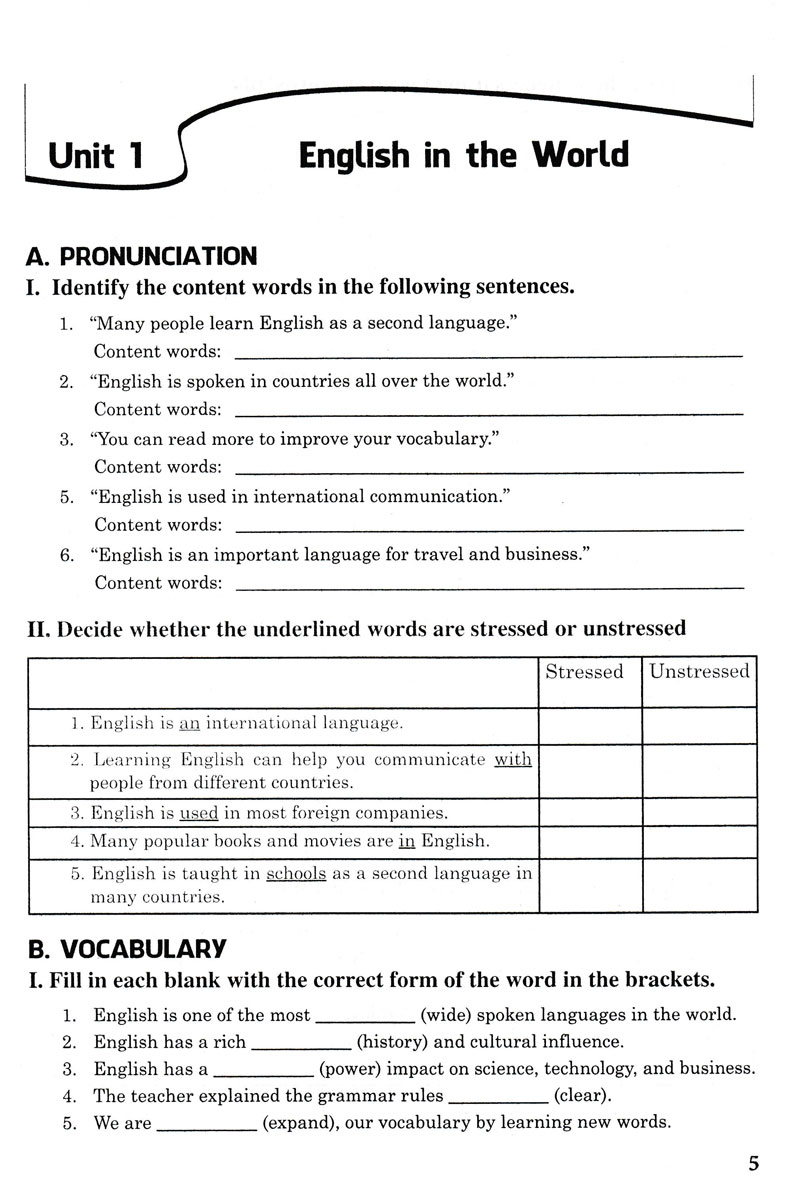 Các bài tập trong mỗi đơn vị bài học được bố cục theo từng phần rõ ràng như sau: