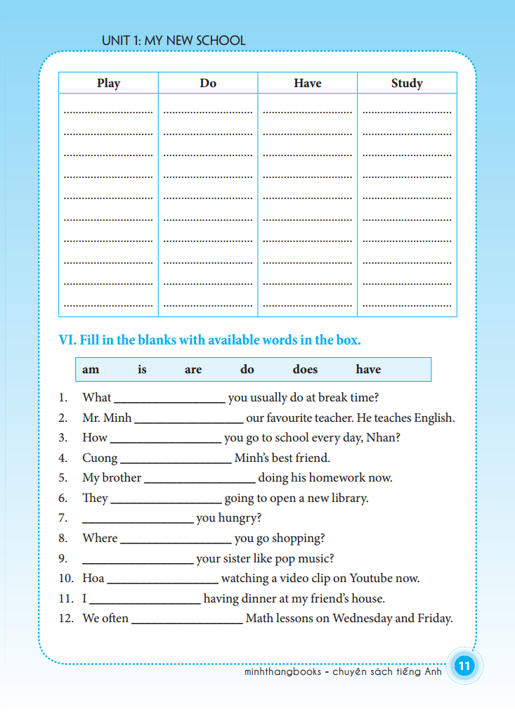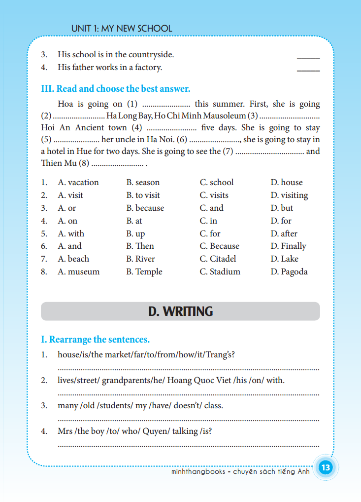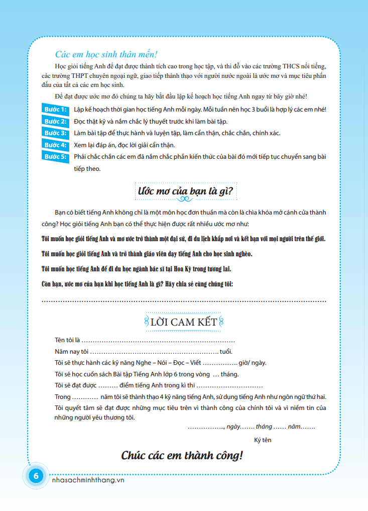 Bài Tập Tiếng Anh Lớp 6 (Không Đáp Án) (Sách Màu) Sách bài tập tiếng anh lớp 6 được biên soạn dành cho học sinh lớp 6, do Nhà xuất bản Đại học Quốc gia Hà Nội phát hành. Dựa vào phương pháp dạy ngôn ngữ giao tiếp (Communicative Language Teaching Method), sách tập trung vào việc phát triển các kỹ năng ngôn ngữ cho học sinh Trung học cơ sở thông qua các dạng bài bổ ích, trong đó tập trung vào luyện ngữ âm, từ vựng, kỹ năng đọc hiểu, kỹ năng viết và sử dụng ngôn ngữ tổng hợp thông qua các bài kiểm tra (Tests), giúp cho các em học sinh có thể tổng hợp kiến thức hiệu quả nhất.