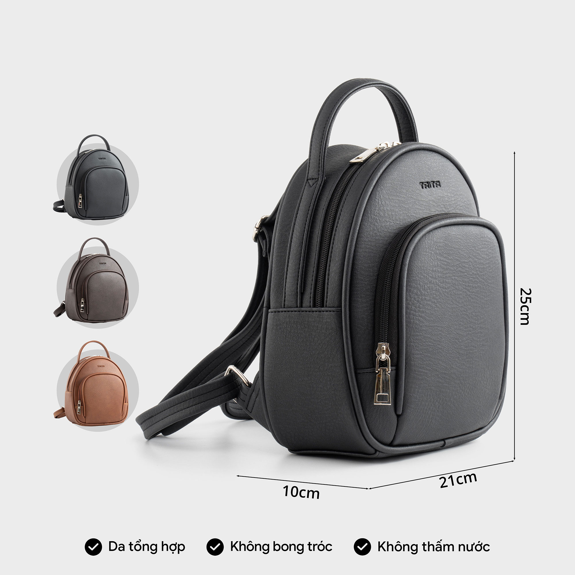 Balo da nữ phối ngăn phong cách basic Trita RBA91 được làm từ chất liệu da tổng hợp có độ bền cao và dễ dàng vệ sinh, với thiết kế có hình dáng gần giống hình tròn với các cạnh bo tròn mềm mại. Ngăn trong rộng rãi để được nhiều đồ, phía trước có ngăn phụ với đường viền bo tròn theo hình dáng balo cùng với khóa kéo kim loại sáng bóng tạo điểm nhấn sang trọng. Balo RBA91 sẽ là sự lựa chọn lí tưởng cho những ai đang tìm kiếm một chiếc balo nhỏ gọn nhưng vẫn đủ khả năng chứa đựng những vật dụng hàng ngày.