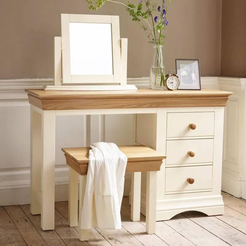 Bàn trang điểm 3 ngăn kéo Country Cottage là thiết kế hiện đại dựa trên phong cách Pháp cổ điển. Sản phẩm được tạo ra từ những thợ mộc lành nghề, đặc trưng bởi những đường viền lõm, cạnh bo tròn mềm mại, mặt chân đế cong uyển chuyền. Các bề mặt cạnh được sơn màu kem tạo độ tương phản bắt mắt với mặt bàn mang màu sắc nâu tự nhiên của chất liệu gỗ sồi trắng Mỹ cao cấp. Ba ngăn kéo có kích thước rộng rãi, là nơi hoàn hảo để giữ cho đồ dùng trong phòng ngủ luôn gọn gàng và ngăn nắp. Hãy kết hợp chiếc bàn trang điểm này với các mẫu gương và ghế cùng bộ sưu tập Country Cottage để hoàn thiện sự đồng bộ cho nội thất phòng ngủ.
