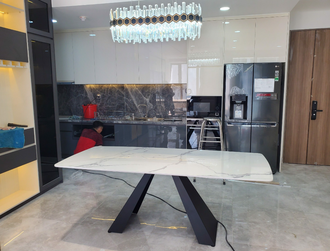 Chất liệu: mặt đá ceramic chống thấm ố, trầy xước đi kèm với chân khung sắt sơn tĩnh điện.