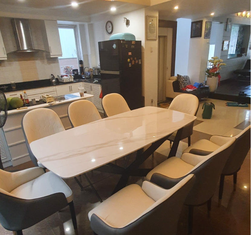 Kết cấu: chân bàn gắn kết với nhau bằng các khung sắt hộp đảm bảo kết cấu có thể chịu được mặt đá 2m kết hợp 6-10 ghế