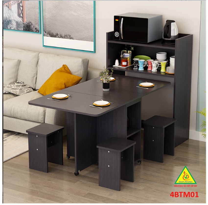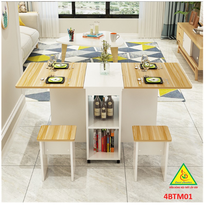 Bàn ăn gấp gọn thông minh Với các gia đình có diện tích phòng ăn không lớn lắm thì Bàn ăn gấp gọn này chính là sự lựa chọn lý tưởng nhất. Bàn ăn có kích thước nhỏ gọn, kết cấu thông minh có thể gấp gọn lại khi không sử dụng tiết kiệm diện tích. Bàn được làm bằng gỗ công nghiệp MDF cao cấp phủ melamine láng mịn, tính thẩm mỹ cao thu hút được sự chú ý của khách hàng. Tích hợp 3 in 1: Bàn, Tủ và Kệ thật Sang - Chảnh - Đẳng Cấp Dù nhà lớn hay nhỏ thì chiếc Bàn Ăn Thông Minh sẽ làm không gian gọn gàng hơn, thoáng hơn và đẹp hơn.