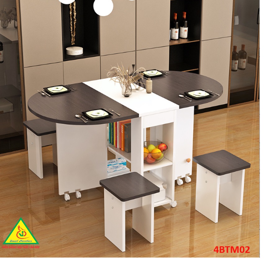 Bàn ăn gấp gọn thông minh Với các gia đình có diện tích phòng ăn không lớn lắm thì Bàn ăn gấp gọn này chính là sự lựa chọn lý tưởng nhất. Bàn ăn có kích thước nhỏ gọn, kết cấu thông minh có thể gấp gọn lại khi không sử dụng tiết kiệm diện tích. Bàn được làm bằng gỗ công nghiệp MDF cao cấp phủ melamine láng mịn, tính thẩm mỹ cao thu hút được sự chú ý của khách hàng. Tích hợp 3 in 1: Bàn, Tủ và Kệ thật Sang - Chảnh - Đẳng Cấp Dù nhà lớn hay nhỏ thì chiếc Bàn Ăn Thông Minh sẽ làm không gian gọn gàng hơn, thoáng hơn và đẹp hơn.