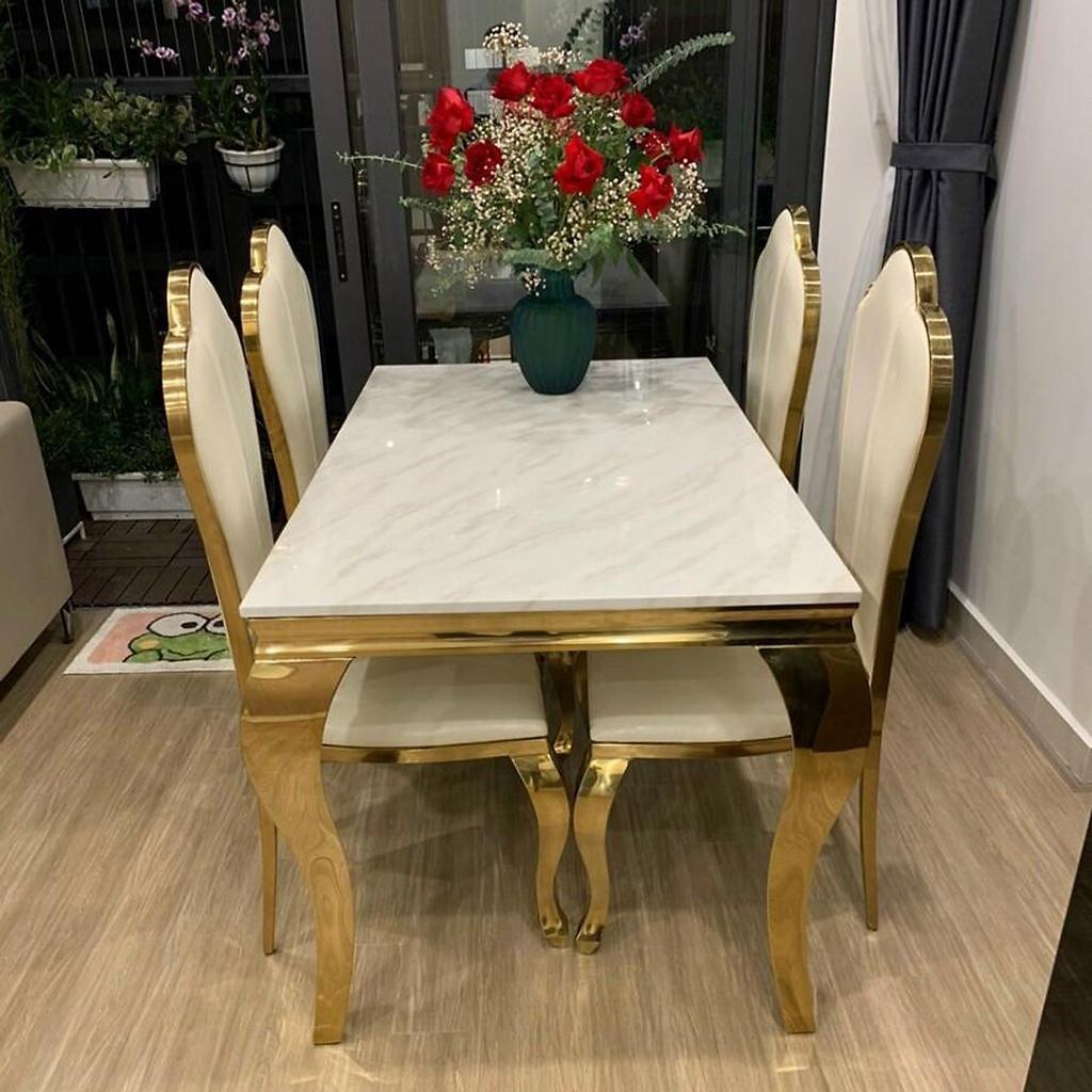Bộ bàn ghế ăn mặt đá cẩm thạch nhân tạo khung thép mạ vàng PVDChất liệu:Mặt bàn được làm từ đá cẩm thạch nhân tạo được xử lý chống ố, chống thấm, gia công hoàn thiện tinh xảo. Khung chân bàn được