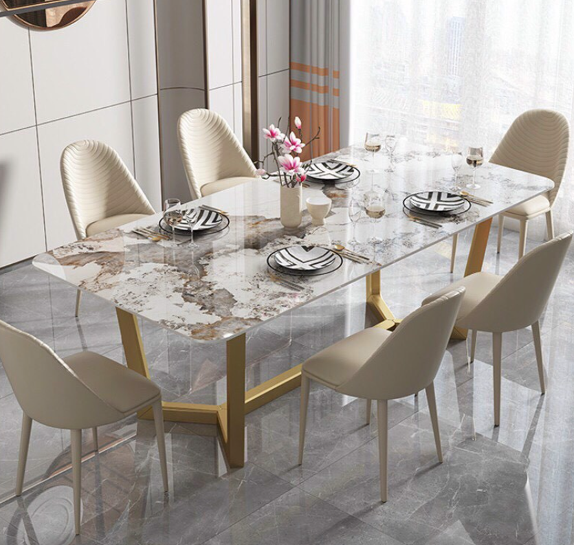 Chất liệu: mặt đá ceramic chống thấm ố, trầy xước với những đường vân tinh tế, đẹp mắt đi kèm với chân inox mạ vàng PVD cao cấp chống gỉ.