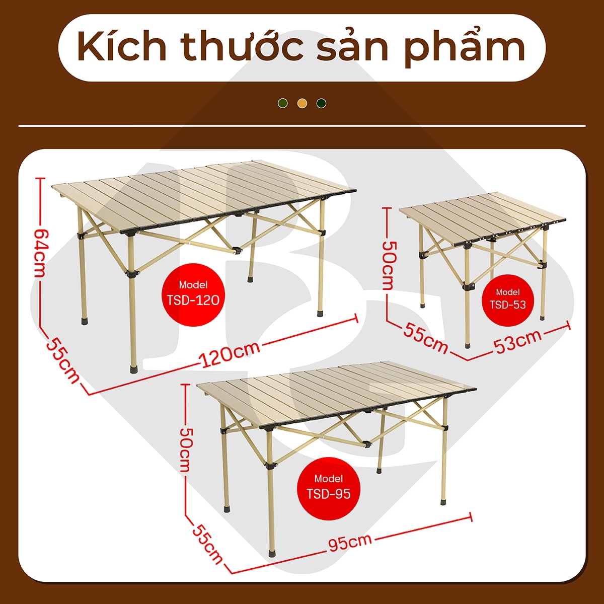 Bàn gấp di động, bàn cắm trại (màu đen) ️Được làm từ chất liệu tốt, chắc chắn, bền bỉ, tuổi thọ cao. ️Có thể gấp lại và trải ra để sử dụng dễ dàng, tiện lợi, không rắc rối ️Trọng lượng nhẹ, đi kèm túi xách, dễ dàng mang theo, tiết kiệm không gian. ️ Chất liệu chống thấm nước Dễ dàng để làm sạch ️Kích thước vừa phải Có thể được sử dụng cho nhiều mục đích. Có thể sử dụng theo nhiều cách như hoạt động ngoài trời, quầy bán hàng, cắm trại, họp mặt gia đình nhỏ TSD-53 Kích thước: 53x52x50 cm. TSD-95 Kích thước: 95x55x50 cm. TSD-120 Kích thước: 120x55x50 cm.