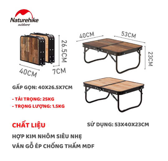 BÀN CẮM TRẠI MDF VINTAGE 2 MỨC CHIỀU CAO NATUREHIKE NH20JJ028 * THÔNG TIN SẢN PHẨM: - Thương hiệu: NatureHike - Dòng sản phẩm: Glamping - Mã sản phẩm: NH20JJ028 - Chất liệu: Hợp kim nhôm / Ván MDF (Độ dày 4mm) - Kích thước & Trọng lượng: +Bàn nhỏ: Kích thước sử dụng 53x40x23cm, Kích thước gấp gọn 26.5x40x7cm; Trọng lượng 1.5kg + Bàn to: Kích thước sử dụng 90x60x37cm; Kích thước gấp gọn 46x60x7cm; Trọng lượng 3,6kg - Tải trọng: 25kg - Màu sắc: Nâu, Gỗ tự nhiên - Xuất xứ: Trung Quốc