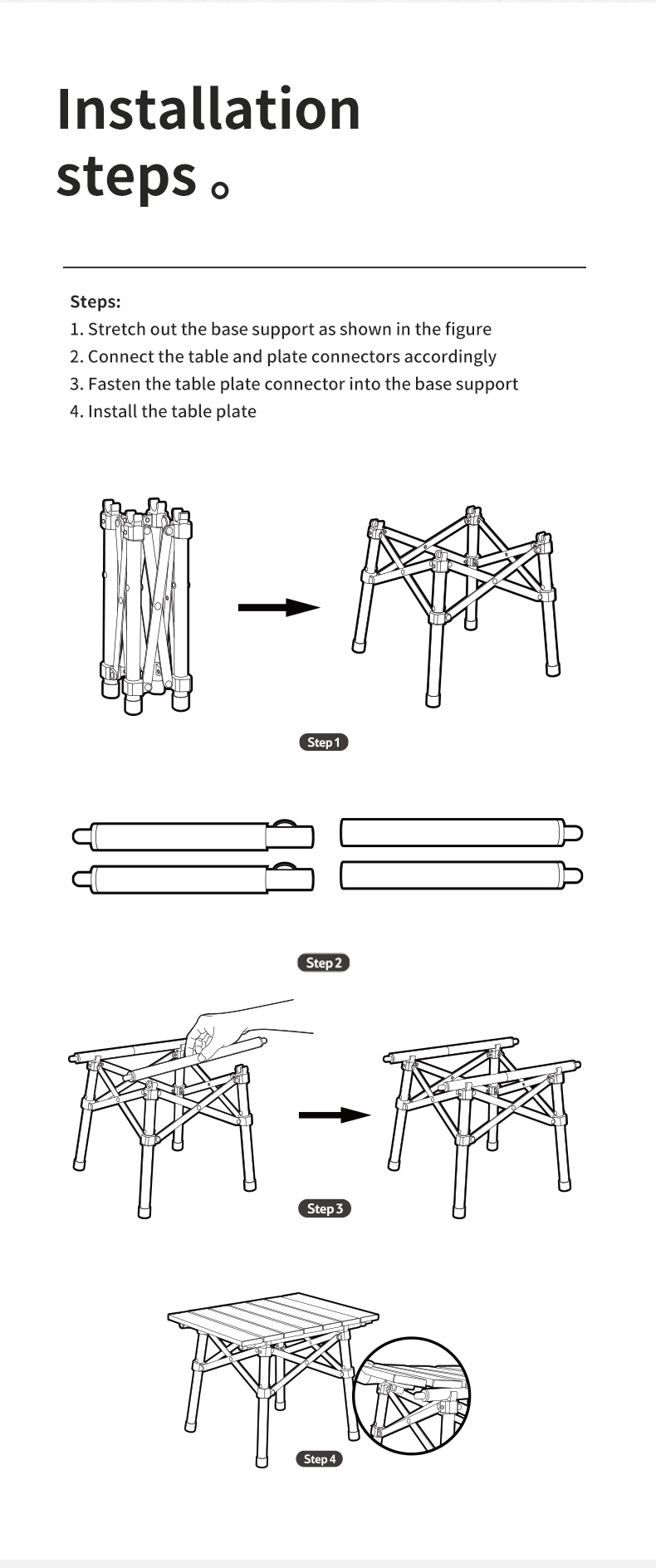 Thiết kế chân bàn hình chữ X chéo nhau nhìn vào rất mạnh mẽ chống trã với thiên nhiên, mặt bàn như một phiếng lá mở rộng khi mở chúng ra khép vào chỉ còn