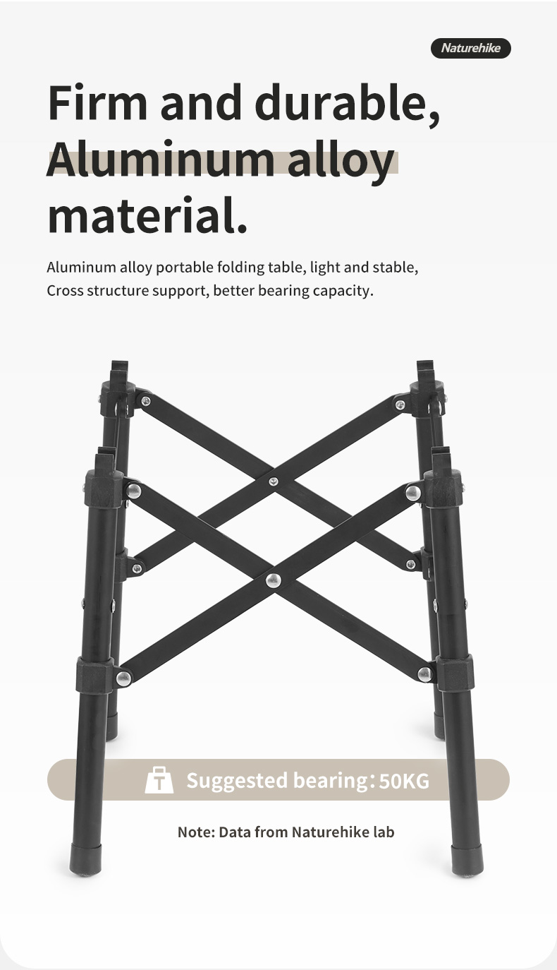 NatureHike CNH22JU038 chất liệu hợp kim nhôm vân gỗ nhẹ, bền và vô cùng sang trọng. Thiết kế khung bàn chữ X hỗ trợ ổn định hơn, tải trọng cao tới 30kg. Khung bàn có thể