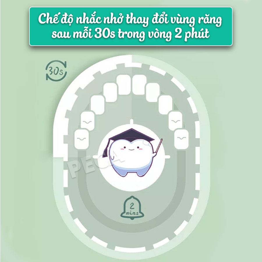 - Cứ sau 30s máy sẽ ngắt khoảng 0.5 - 1s để nhắc chuyển khu vực chải răng. Sau 2 phút máy sẽ tự động tắt.