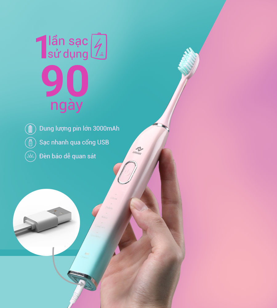 - Động cơ sản phẩm mạnh mẽ, linh hoạt, hoạt động ổn định. Nút điều khiển trên thân máy dễ thao tác với các chú thích rõ ràng. Thời gian sử dụng 90 ngày Bàn chải đánh răng Life 360 sử dụng cổng sạc USB tiện lợi, chỉ với một lần sạc đầy bạn có thể sử dụng trong 90 ngày. Thông số kỹ thuật