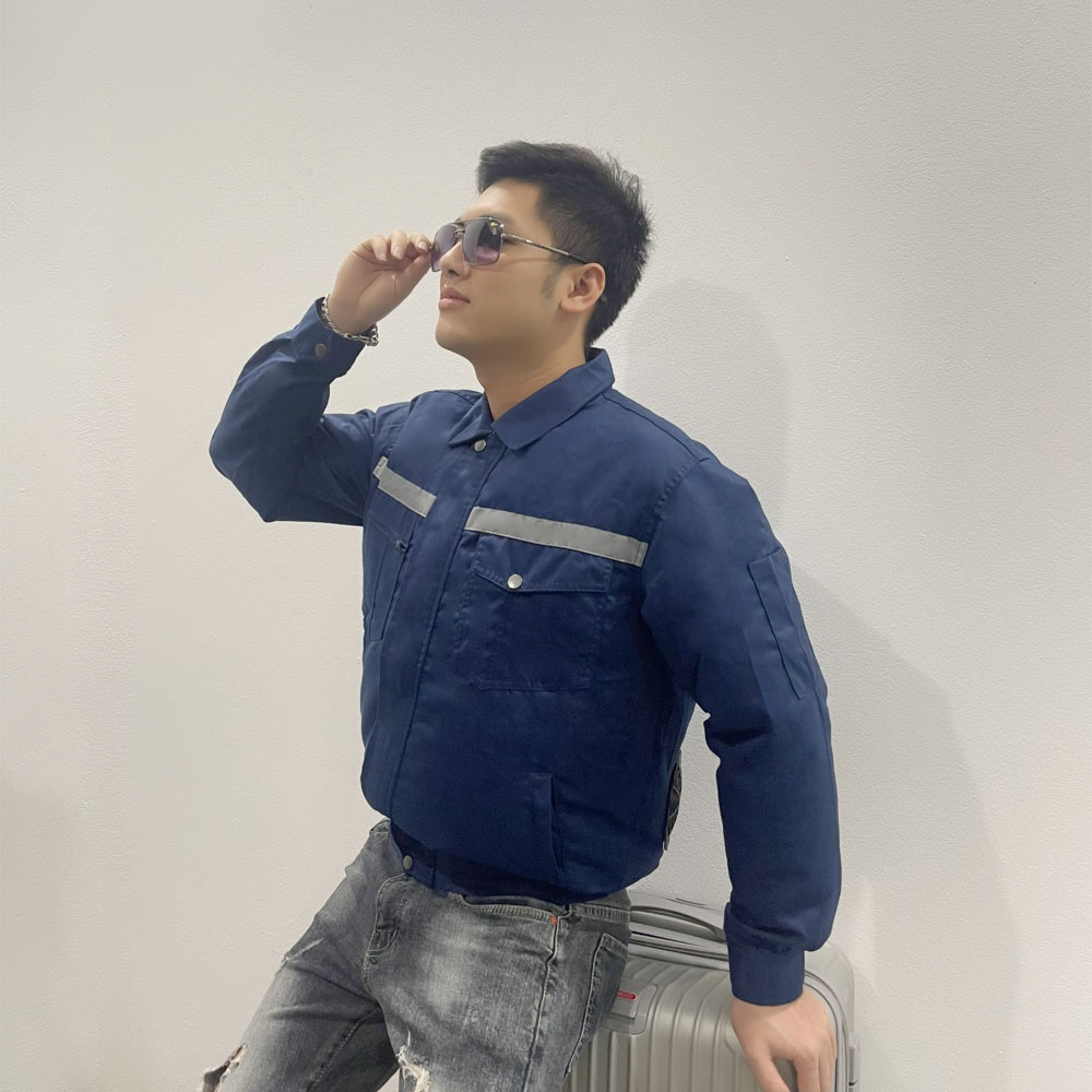 - Áo sử dụng 2 quạt thổi không khí từ ngoài làm mát, giảm nhiệt độ, điều hoà toàn bộ cơ thể.