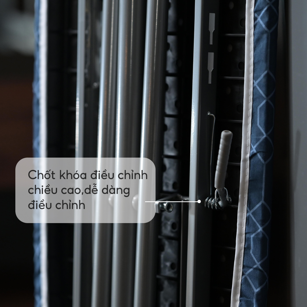 Khung kim loại chắc chắn Khung bằng kim loại, chịu lực tốt và có độ bền cao. Mặt bàn để ủi được làm bằng ván ép chất lượng, đủ độ cứng nhưng vẫn gọn nhẹ
