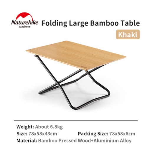 Thông tin sản phẩm: - Thương hiệu: NatureHike - Mã sản phẩm: NH22JU012 - Chất liệu: - Mặt bàn: Gỗ tre - Khung bàn: hợp kim nhôm - Túi vải: Vải Oxford 630D - Kích thước sử dụng: 785843cm - Kích thước gấp gọn: 78586cm - Trọng lượng: 6,8kg - Tải trọng: 30kg - Màu sắc: Màu gỗ tự nhiên - Xuất xứ: Trung Quốc