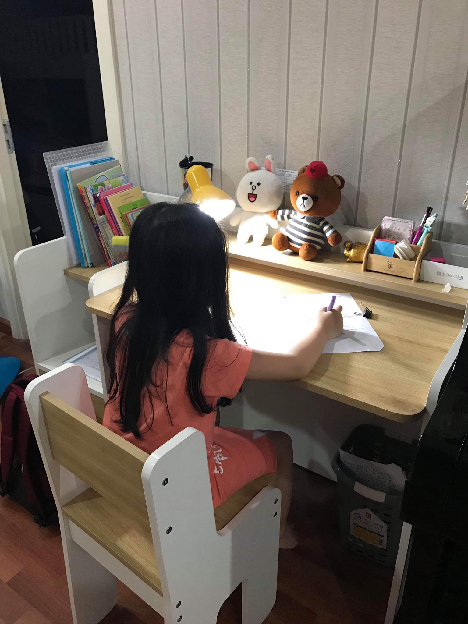 Bàn học sinh bằng gỗ có kệ sách - Bàn ngồi học tăng giảm chiều cao chống gù cho trẻ em có giá treo