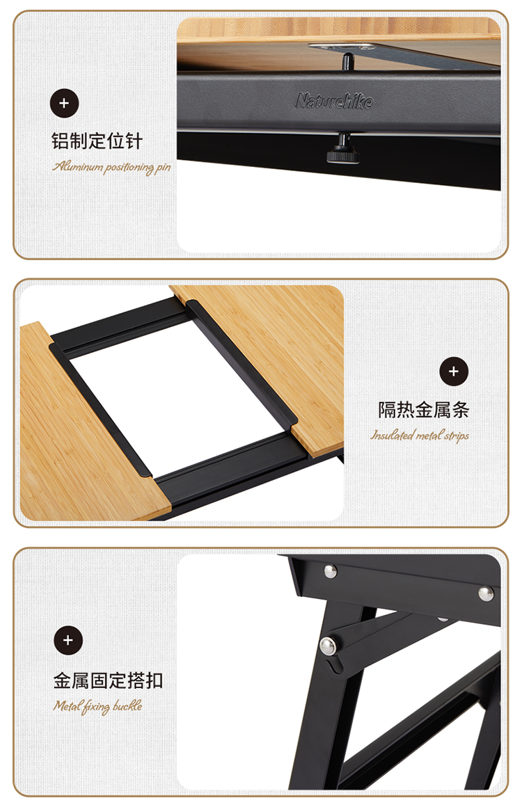 MÔ TẢ SẢN PHẨM BÀN IGT MẶT GỖ TRE RAY TRƯỢT NATUREHIKE NH22JU010 * THÔNG TIN SẢN PHẨM - Thương hiệu: NatureHike - Mã sản phẩm: NH22JU010 - Chất liệu: + Khung bàn: Hợp kim