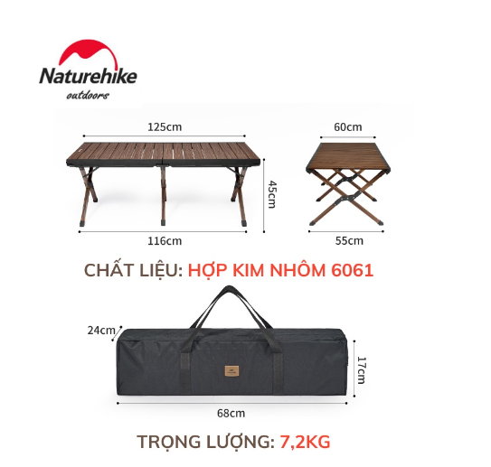 MÔ TẢ SẢN PHẨM - Thương hiệu: NatureHike - Mã sản phầm: NH20JJ020 - Chất liệu: + Mặt bản: Vải Oxford 1680D + Khung bàn: Hợp kim nhôm - Kích thước & Trọng lượng: +