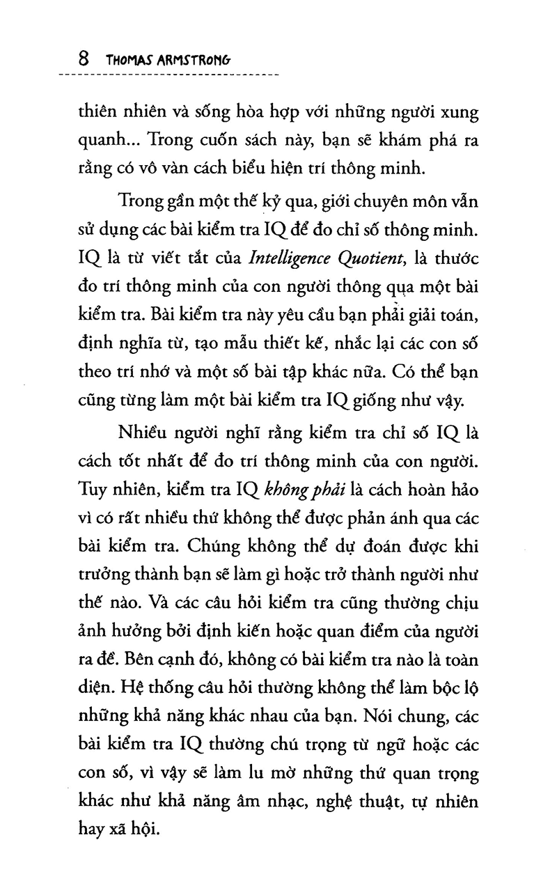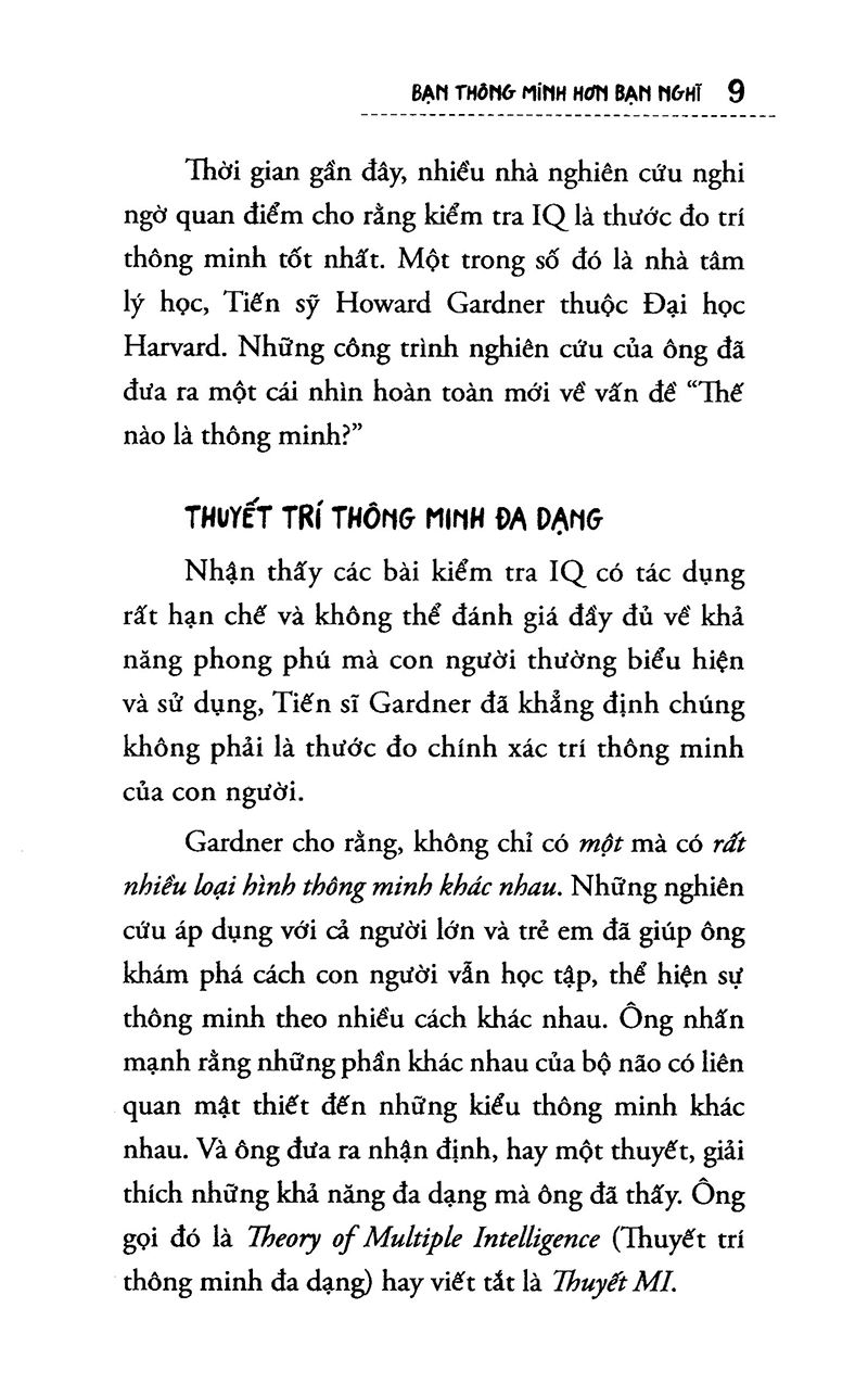 Bạn Thông Minh Hơn Bạn Nghĩ Bạn có nghĩ mình thông minh không? Và trí thông minh là gì? Nhiều người tin rằng thông minh là phải đạt điểm tốt hoặc giành thứ hạng cao ở trường học. Hoặc thông minh là làm được những việc như: Đọc thật tốt Giải toán nhanh Học thuộc lòng giỏi Những điều này có thể khiến bạn ngạc nhiên bởi trí thông minh có thể biểu hiện theo nhiều cách thức khác nhau – trong nghệ thuật, âm nhạc, thể thao, trong cách cảm nhận, sự hiểu biết về thiên nhiên và sống hòa hợp với những người xung Bạn thông minh hơn bạn nghĩ sẽ giúp bạn khám phá ra rằng có vô vàn cách biểu hiện trí thông minh. Trong gần một thế kỷ qua, giới chuyên môn vẫn sử dụng các bài kiểm tra IQ để đo chỉ số thông minh. IQ là từ viết tắt của Intelligence Quotient, là thước đo trí thông minh của con người thông qua một bài kiểm tra. Bài kiểm tra này yêu cầu bạn phải giải toán, định nghĩa từ, tạo mẫu thiết kế, nhắc lại các con số theo trí nhớ và một số bài tập khác nữa. Có thể bạn cũng từng làm một bài kiểm tra IQ giống như vậy. Nhiều người nghĩ rằng kiểm tra chỉ số IQ là cách tốt nhất để đo trí thông minh của con người. Tuy nhiên, kiểm tra IQ không phải là cách hoàn hảo vì có rất nhiều thứ không thể phản ánh qua các bài kiểm tra. Chúng không thể dự đoán được khi trưởng thành bạn sẽ làm gì hoặc trở thành người như thế nào. Và các câu hỏi kiểm tra cũng thường chịu ảnh hưởng bởi định kiến hoặc quan điểm của người ra đề. Bên cạnh đó, không có bài kiểm tra nào là toàn diện. Hệ thống câu hỏi thường không thể làm bộc lộ những khả năng khác nhau của bạn. Nói chung, các bài kiểm tra IQ thường chú trọng từ ngữ hoặc các con số, vì vậy sẽ làm xao lãng những thứ quan trọng khác như khả năng âm nhạc, nghệ thuật, tự nhiên hay xã hội. Thời gian gần đây, nhiều nhà nghiên cứu nghi ngờ quan điểm cho rằng kiểm tra IQ là thước đo trí thông minh tốt nhất. Một trong số đó là nhà tâm lý học, Tiến sỹ Howard Gardner thuộc Đại học Harvard. Những công trình nghiên cứu của ông đã đưa ra một cái nhìn hoàn toàn mới về vấn đề “Thế nào là thông minh?”