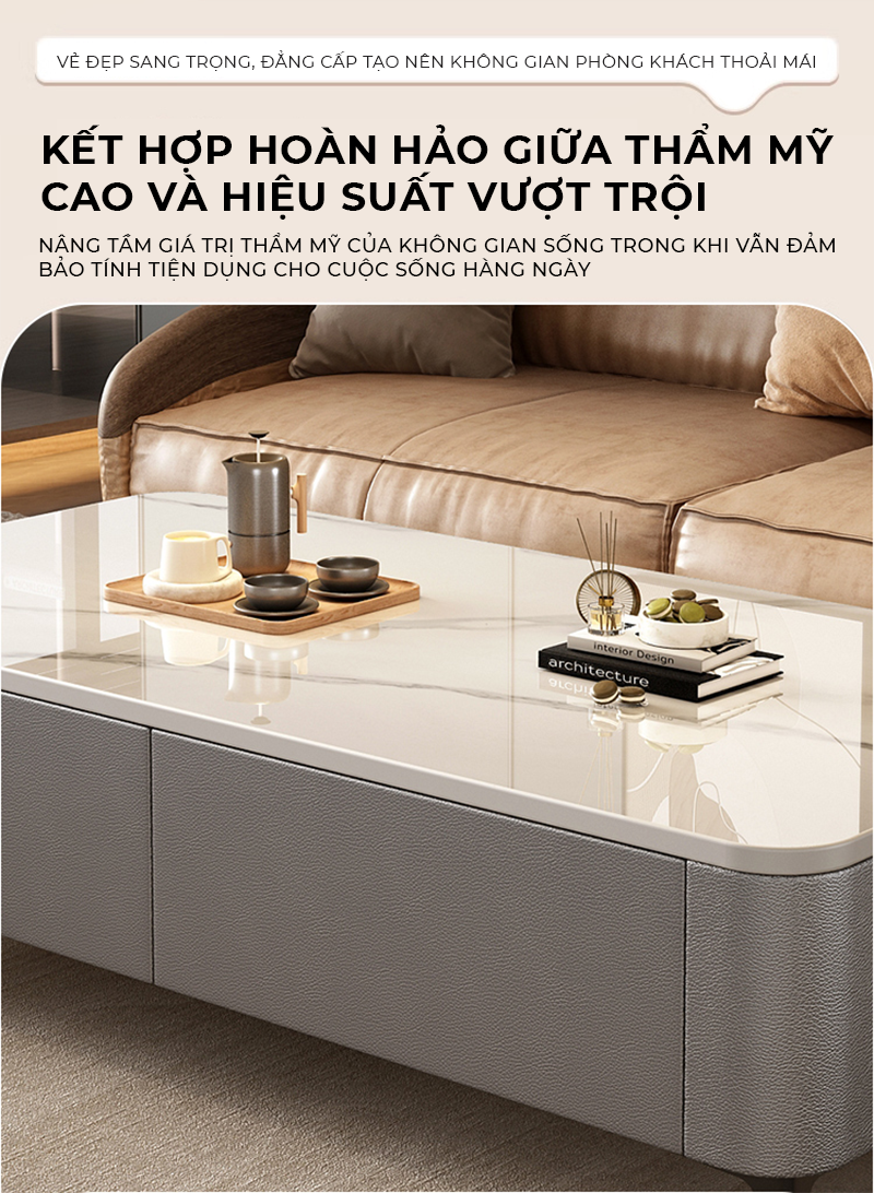 - Công năng: Là mẫu bàn sofa phòng khách sang trọng với thiết kế bọc da quanh viền và mặt bàn màu vân đá hiện đại