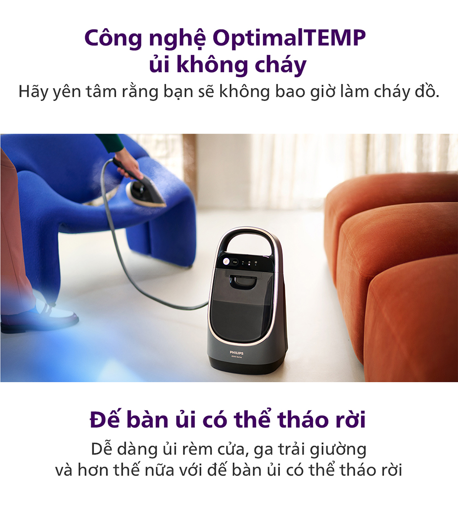 Đặc điểm nổi bật Bàn ủi hơi nước đứng Philips với công nghệ làm nóng kép cho hơi phun mạnh, thấm sâu Công nghệ OptimalTEMP giúp không gây ra vết cháy trên mọi loại vải