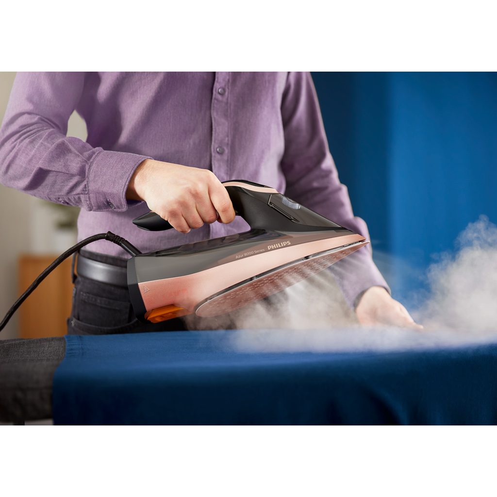 Bàn ủi hơi nước Philips Azur 8000 DST8041/80 Ủi phẳng quần áo chỉ trong một lượt ủi Philips Azur 8000 mang đến hiệu suất ủi mạnh mẽ với hơi phun tăng cường 260g, giúp loại