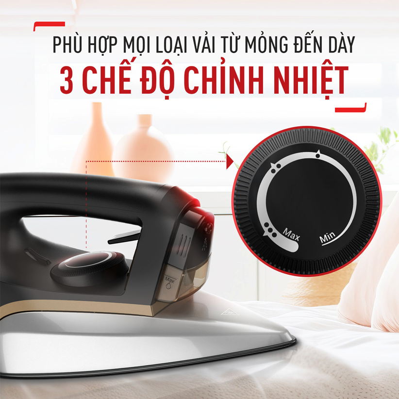 - Chất liệu: Đế bằng hợp kim siêu bền tráng men titanium chống dính tốt. Điện trở đúc giúp nóng nhanh mà nguội nhanh. - Mức nhiệt: Chỉnh nhiệt độ theo từng loại vải như: