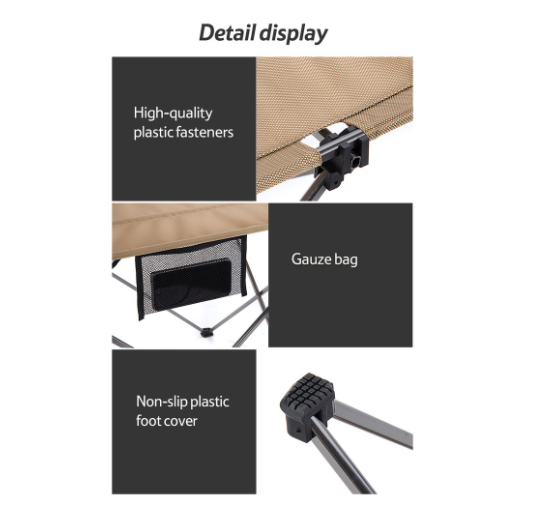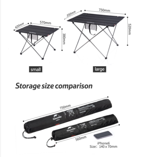 - Thương hiệu: NatureHike - Mã sản phầm: NH20JJ020 - Chất liệu: + Mặt bản: Vải Oxford 1680D + Khung bàn: Hợp kim nhôm - Kích thước & Trọng lượng: + Size S: Kích thước sử dụng 574238cm; Kích thước gấp gọn 566cm; Trọng lượng 0.7kg; Tải trọng 20kg + Size L: Kích thước sử dụng 755552cm; Kích thước gấp gọn 758cm ; Trọng lượng 0.95kg; Tải tromgk 25kg - Màu sắc: Đen, Khaki - Xuất xứ: Trung Quốc